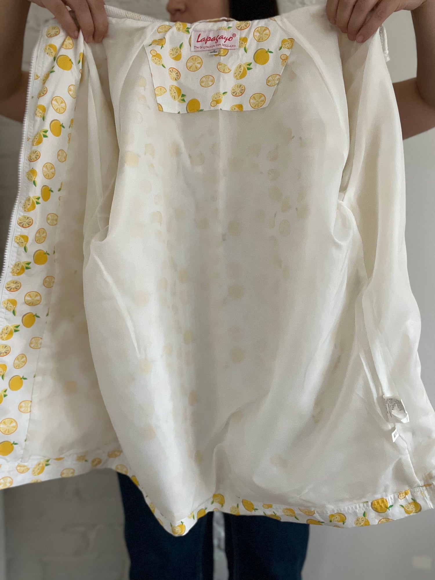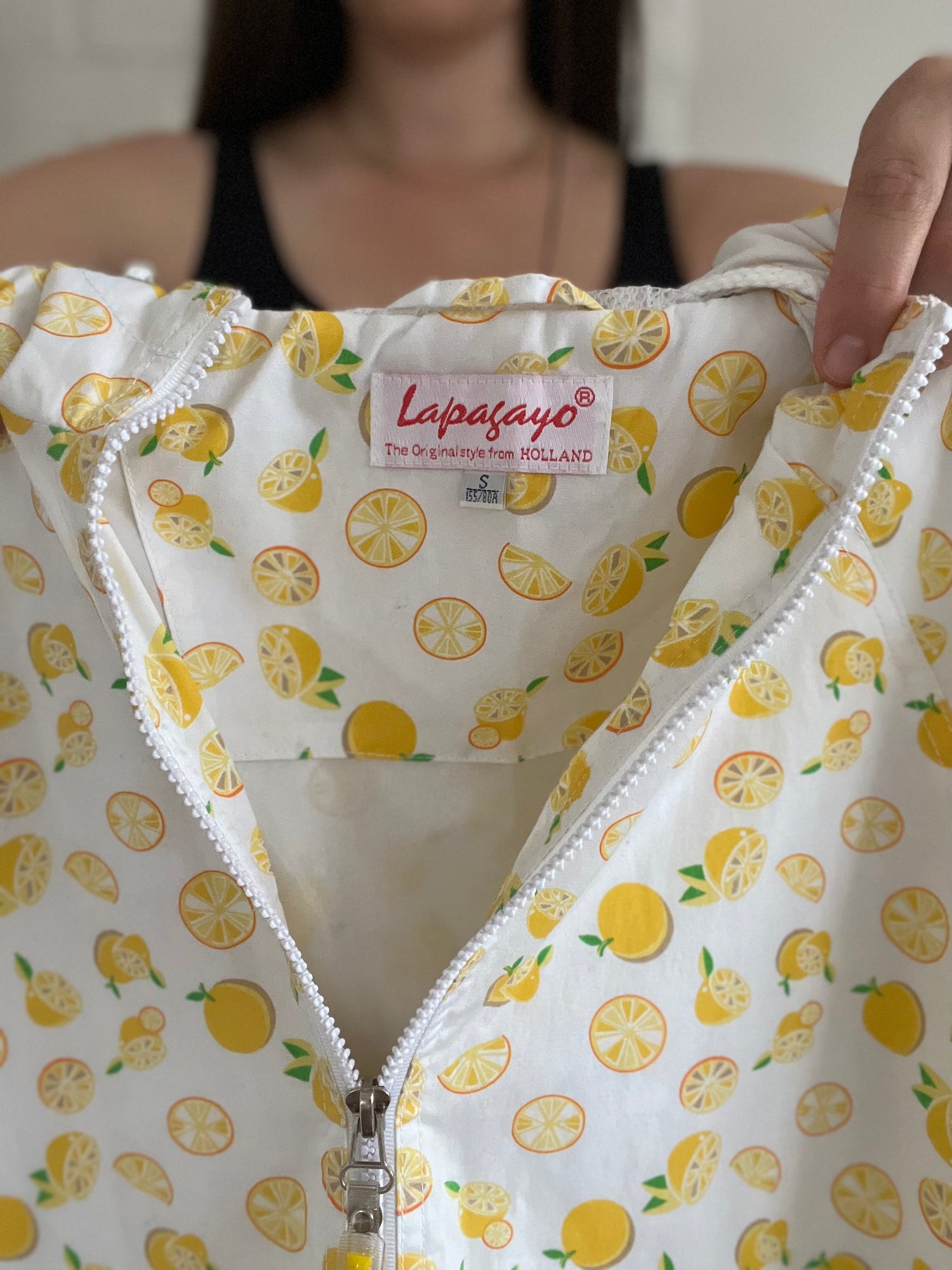 Easy peasy, lemon squeezy! Vintage 80s zip up jacket or waterproof windbreaker, with citrus all over. Lapagayo Holland is an iconic brand in Holland, and this beauty has its vintage roots written all over it. It's lightweight, medium-structured material will keep you warm, dry and looking fresh.