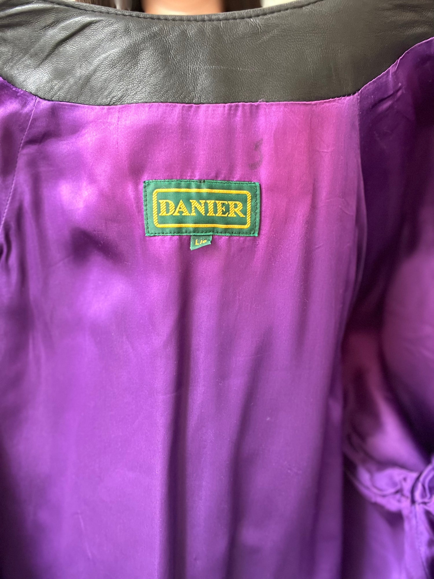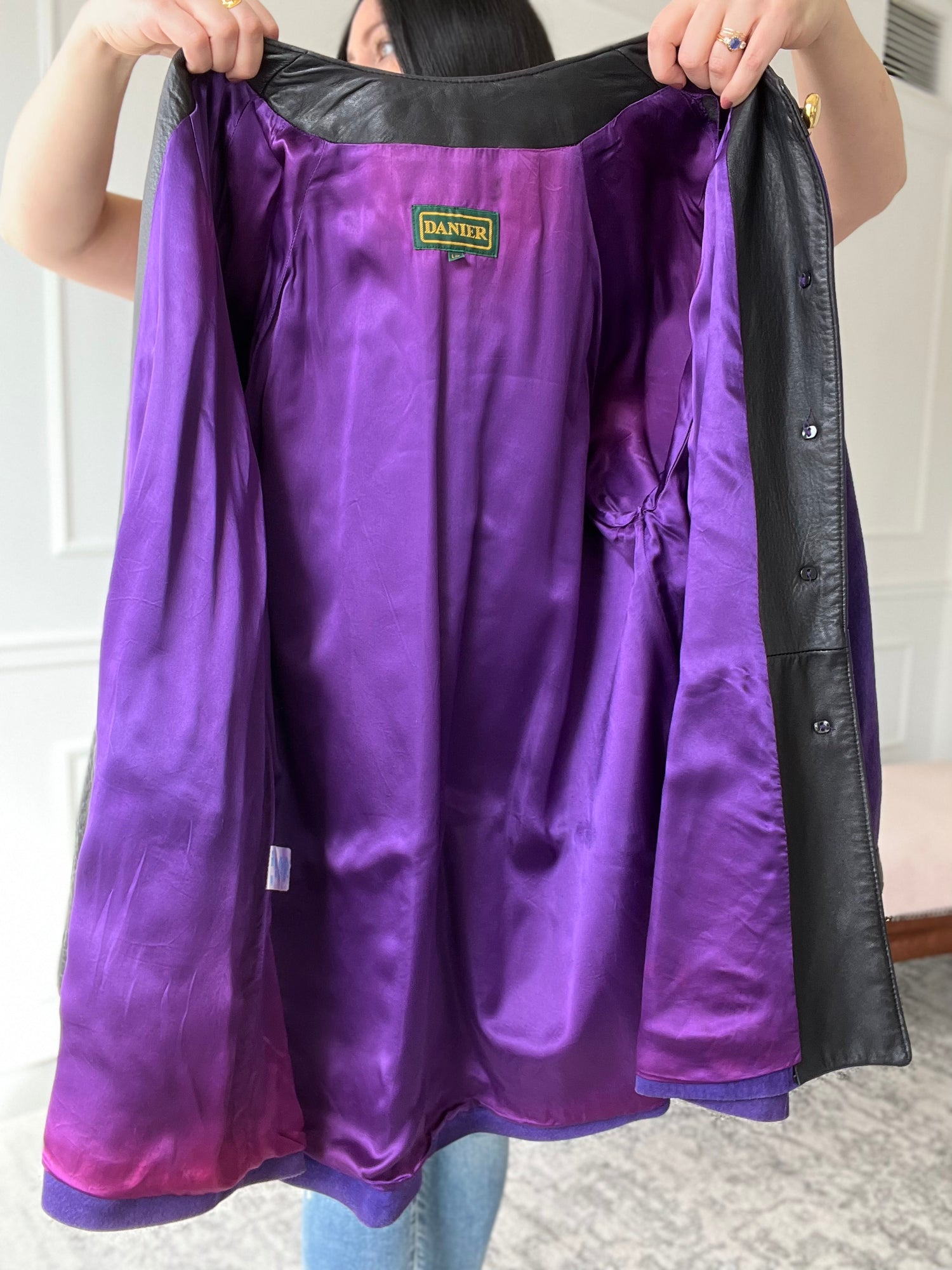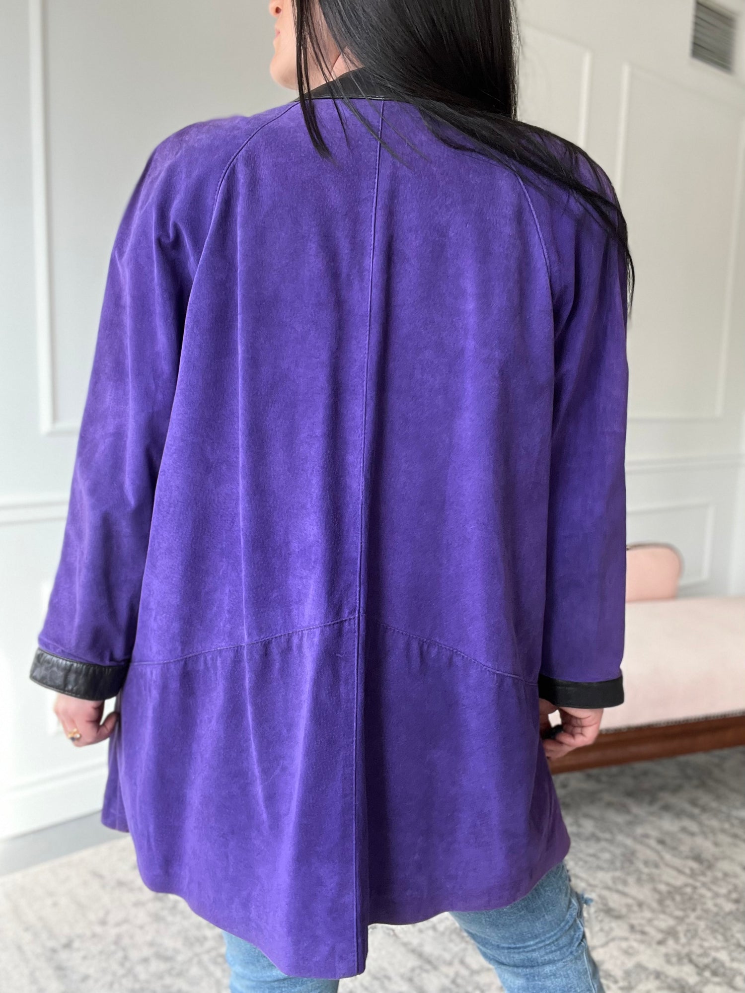 A stunning, rare vintage Danier Leather jacket in bright, punchy purple with black leather trim. An overall weighted suede makes this jacket feel and look rich in texture, accompanied by silver vintage buttons. Unique t-stitch design on back, with a mini bottom flare. Two large front pockets to rest your hands, and lined with a silky-soft interior. Rock this incredible piece this fall, and say goodbye to boring.