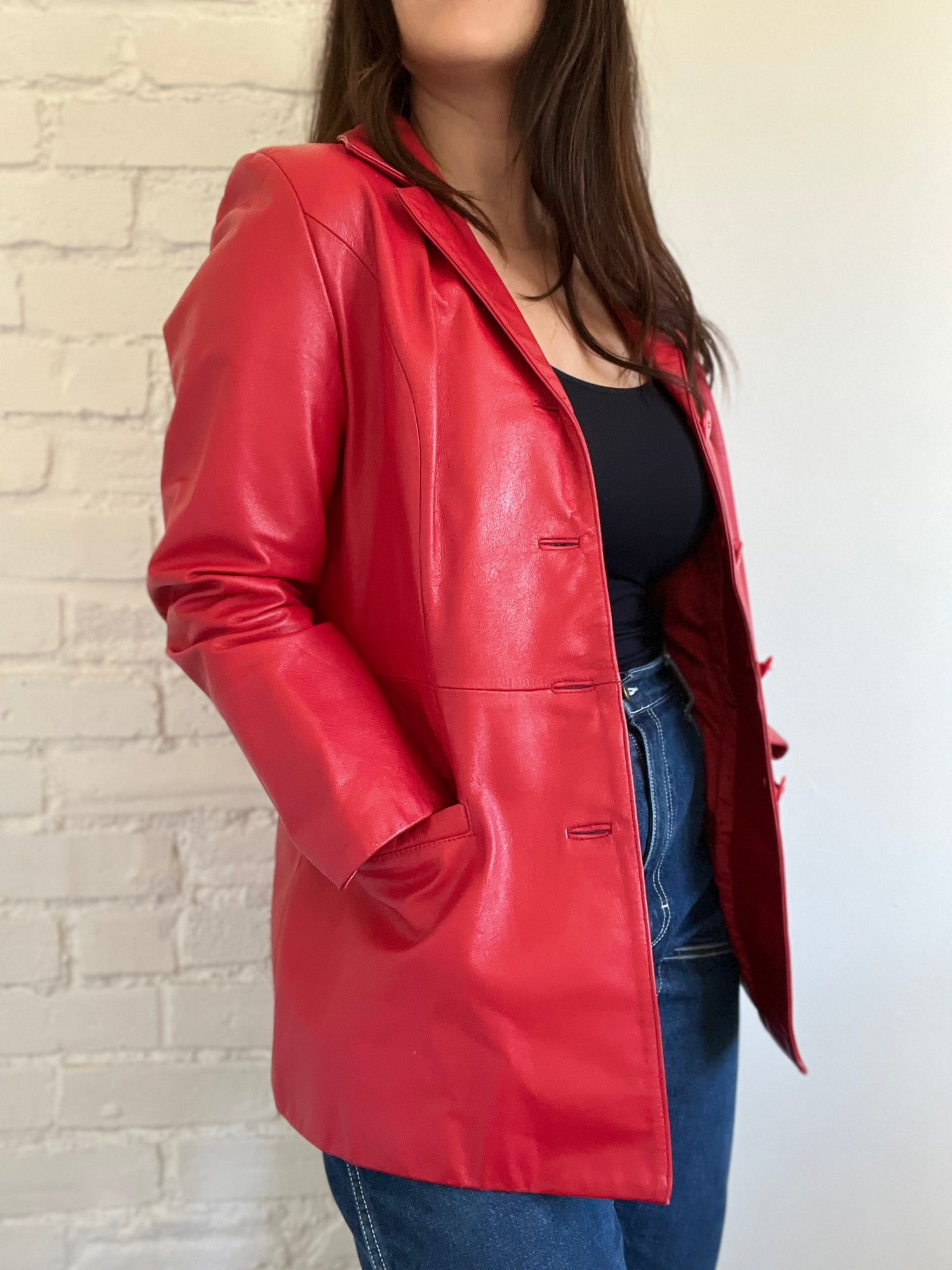 Leather doesn't always have to be black. This punchy red, long leather jacket is a beautiful vintage piece from the 80s, by Danier Leather. The leather has a medium weight with a crisp texture. Striking, and beautiful - this coat will turn heads.