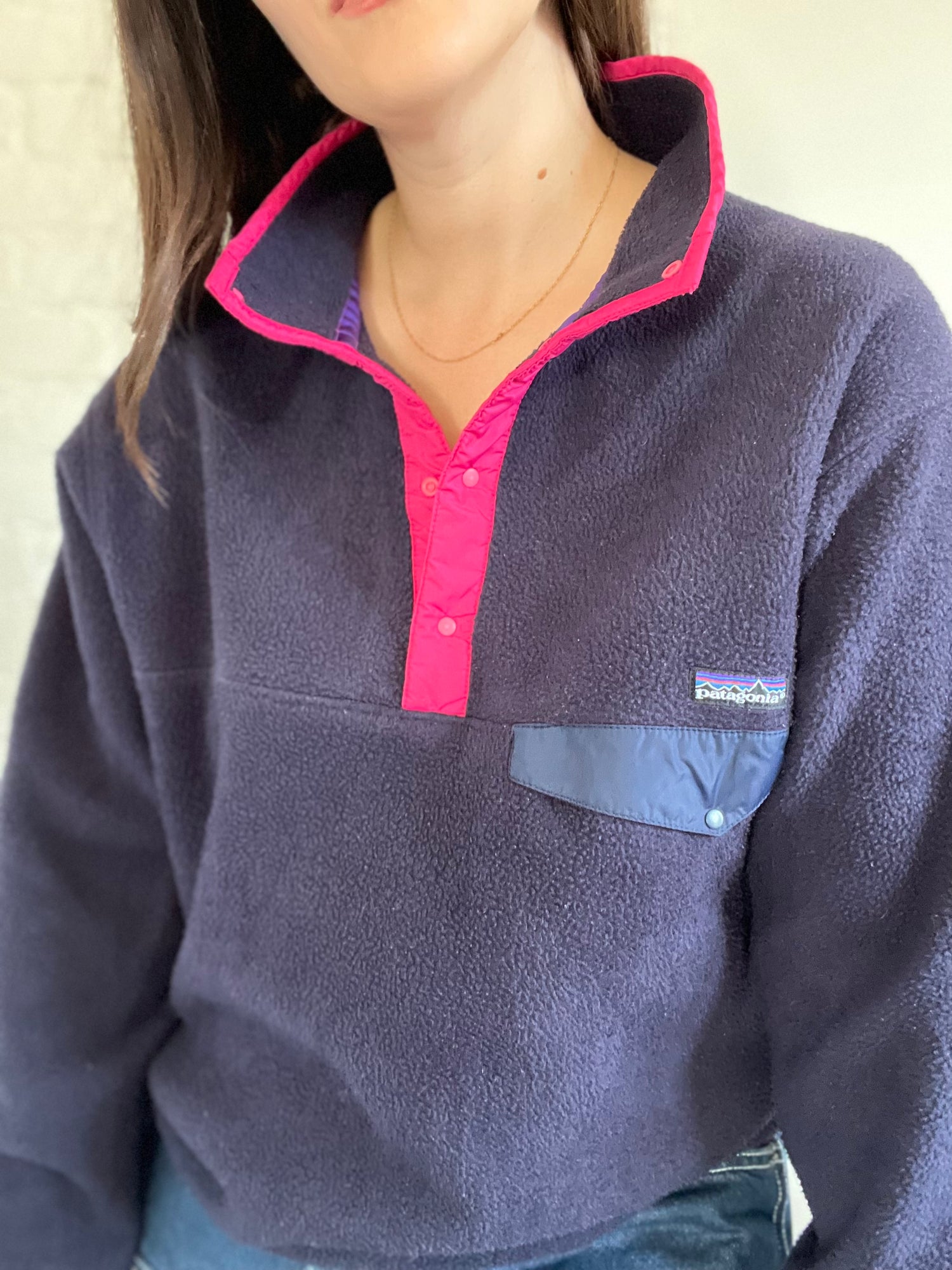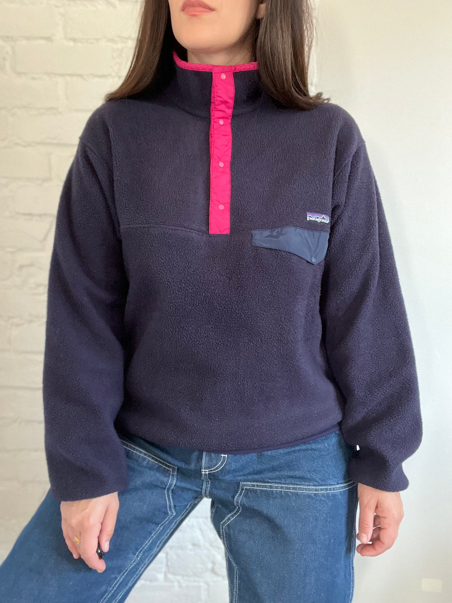 A vintage Patagonia Fleece Synchilla in amazing condition with a rare colour-way. Dark black, with hot pink T-snap buttons. Elasticized at hem and cuffs. Super plushy, and all original tags attached.
