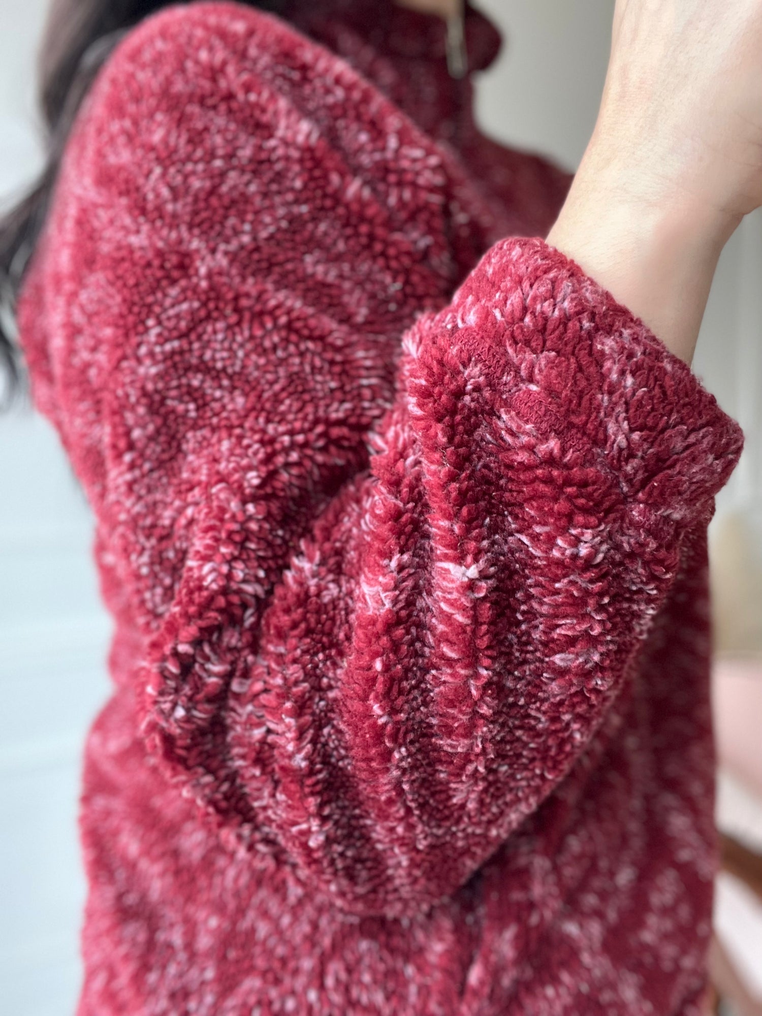 A vintage, red and cream sherpa Patagonia quarter zip pullover. Red satin lined, and in excellent condition. Oldschool silver smooth zipper, and flaunts a unique, abstract 90s design.