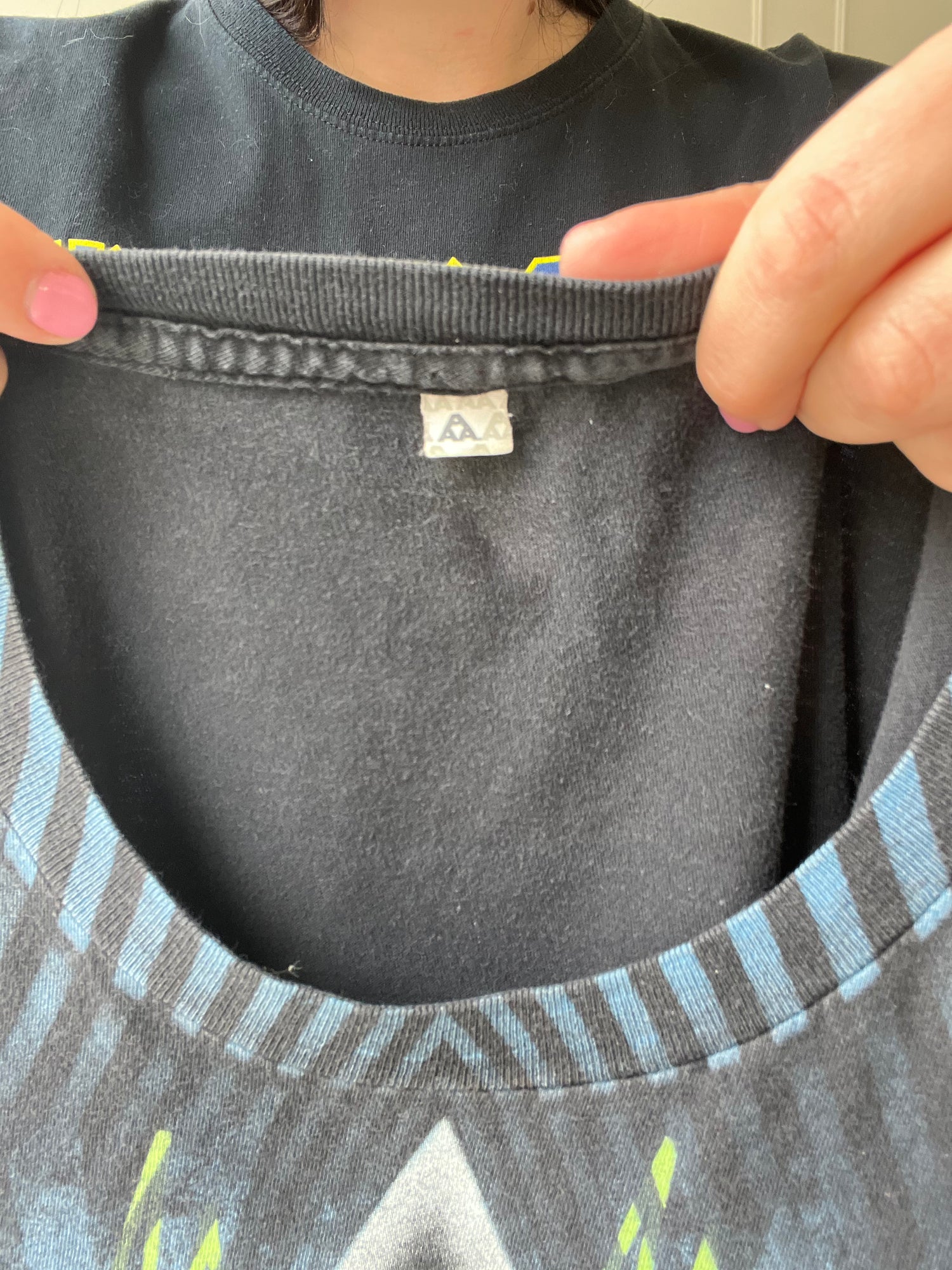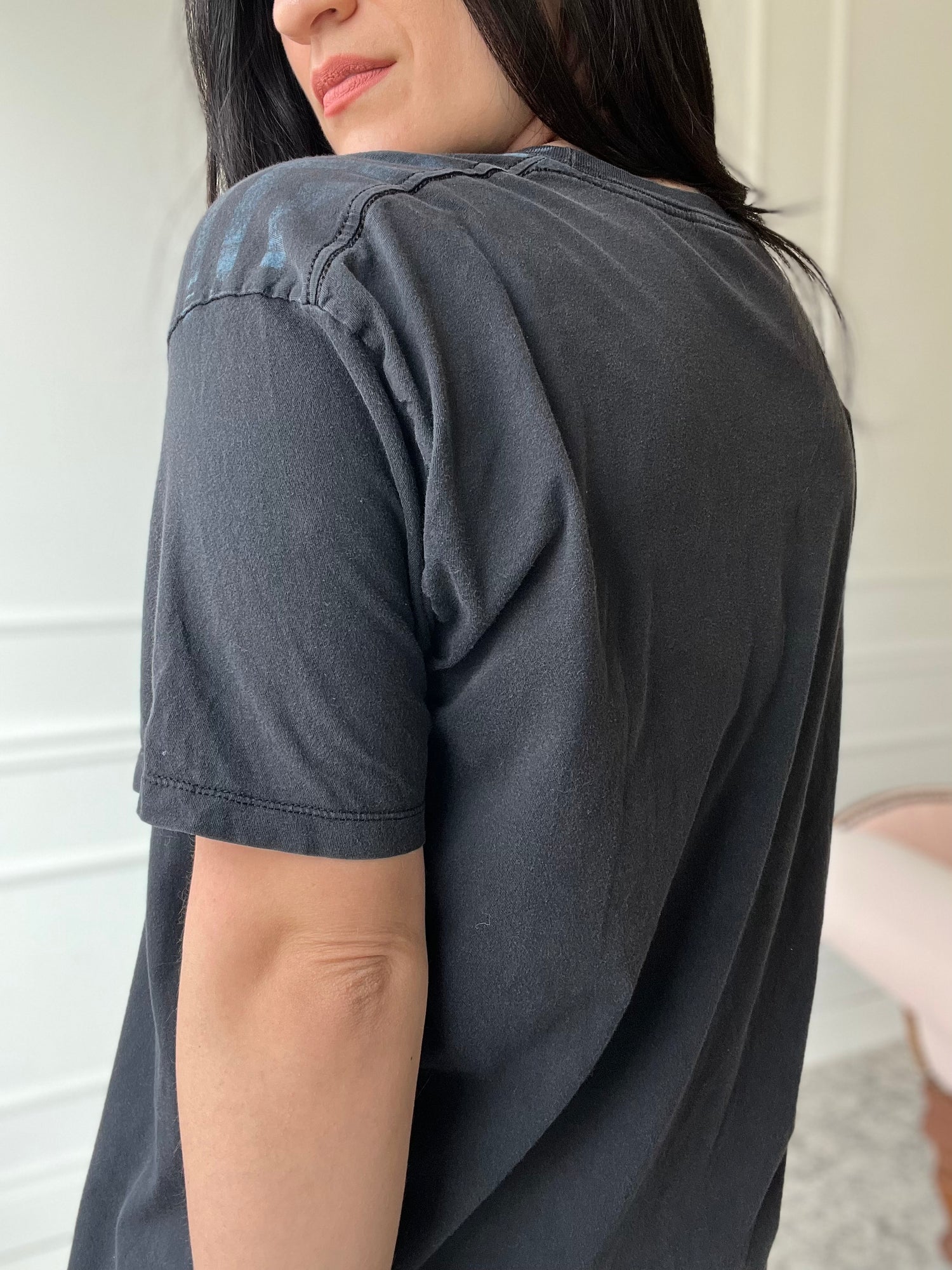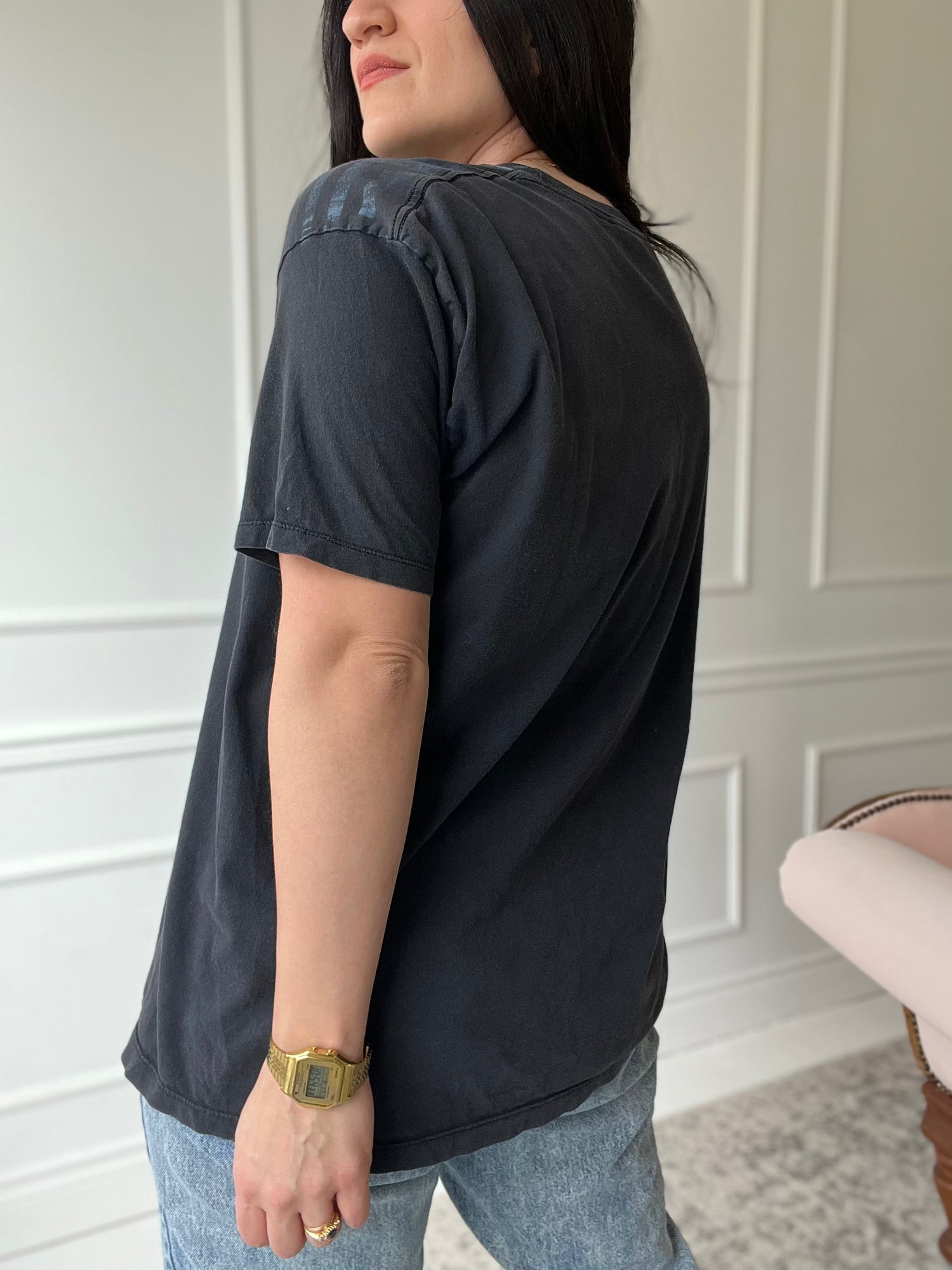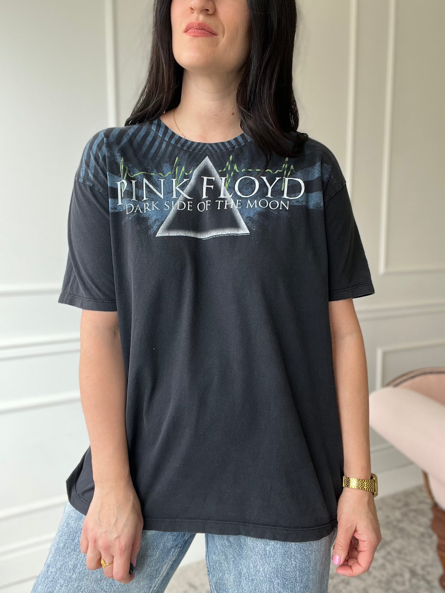 A flawless, vintage Dark Side of the Moon Pink Floyd t-shirt. It's a faded black, with a striking blue and green design across the upper chest and shoulder. This shirt is a super relaxed, buttery soft fit. You can tell by the tag (or lack thereof), this is an older, very special gem.