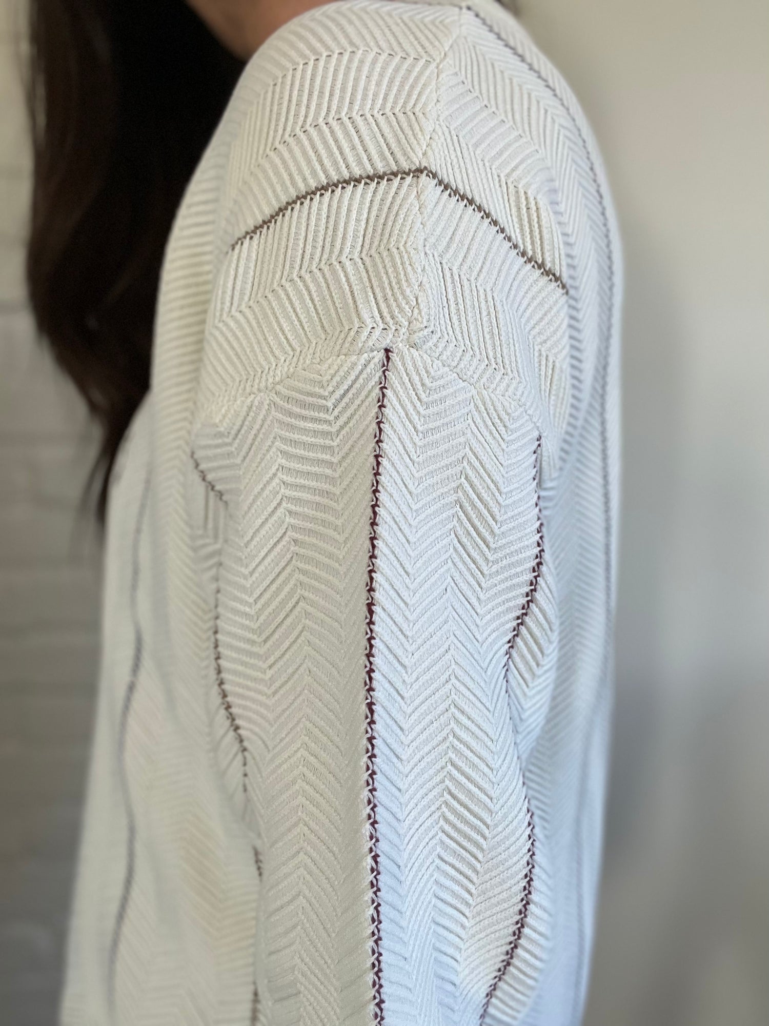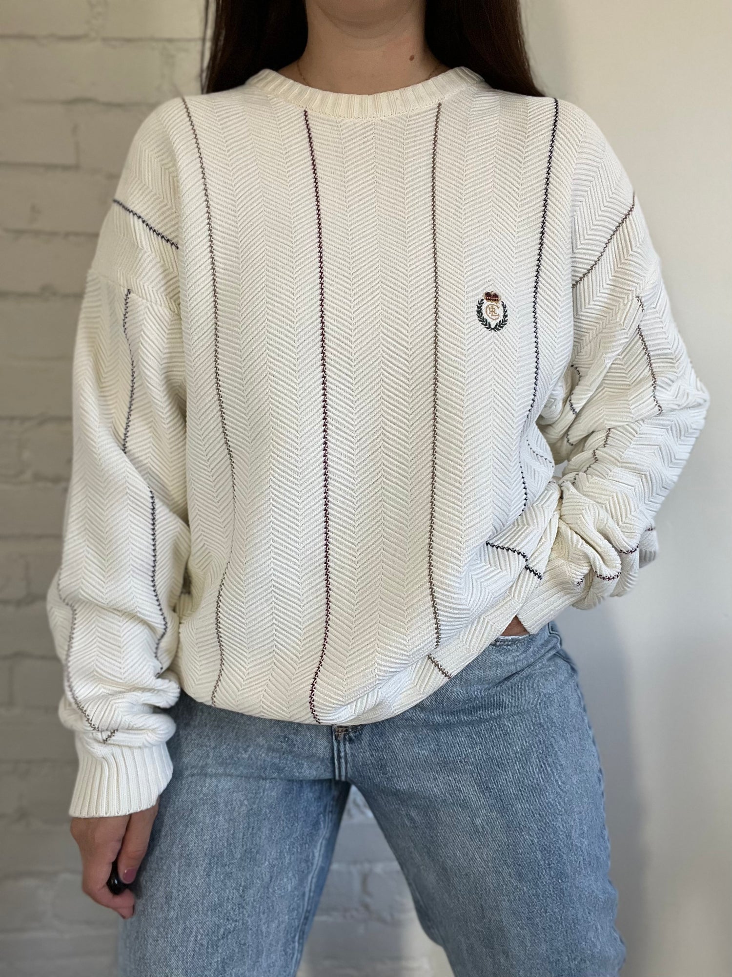 A stunning and perfectly weighted knit sweater with a rich texture all over. Light ivory in colour, with black line seams flowing vertically all over. Original Ralph Lauren crest on upper left chest with crown and leaves. This is a very relaxed fit, and would feel like a blanket on most people. The sweater is in mint condition, and feels brand new. Long enough to cover your backside.