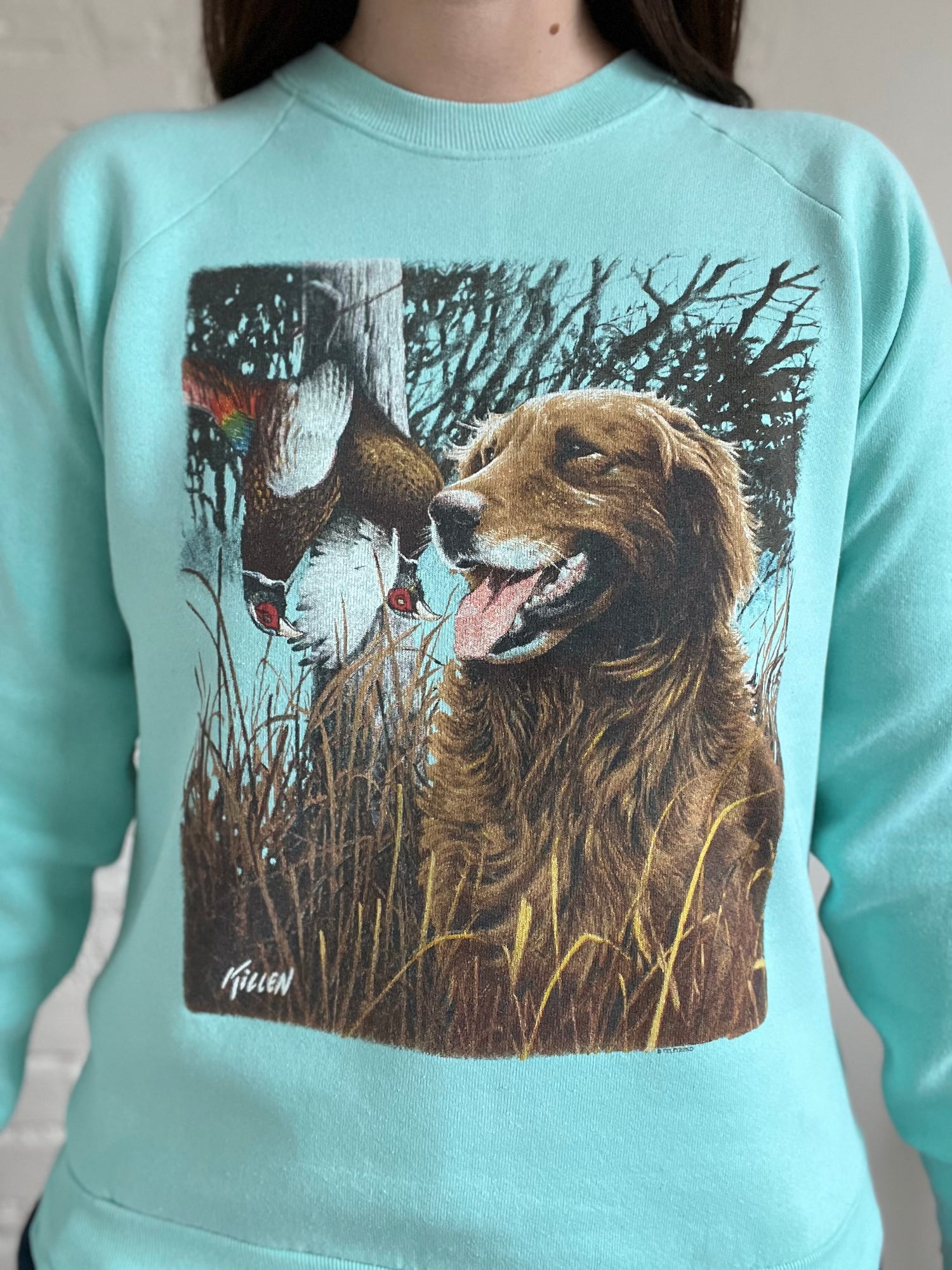 A 90s vintage teal sweater, with an iconic print across the front - by artist Killen. Killen was known for his photography and art of wildlife and dogs. This one is adaptive from the piece, "First Retrieve". Ribbed crewneck and hemline, and great vintage condition.