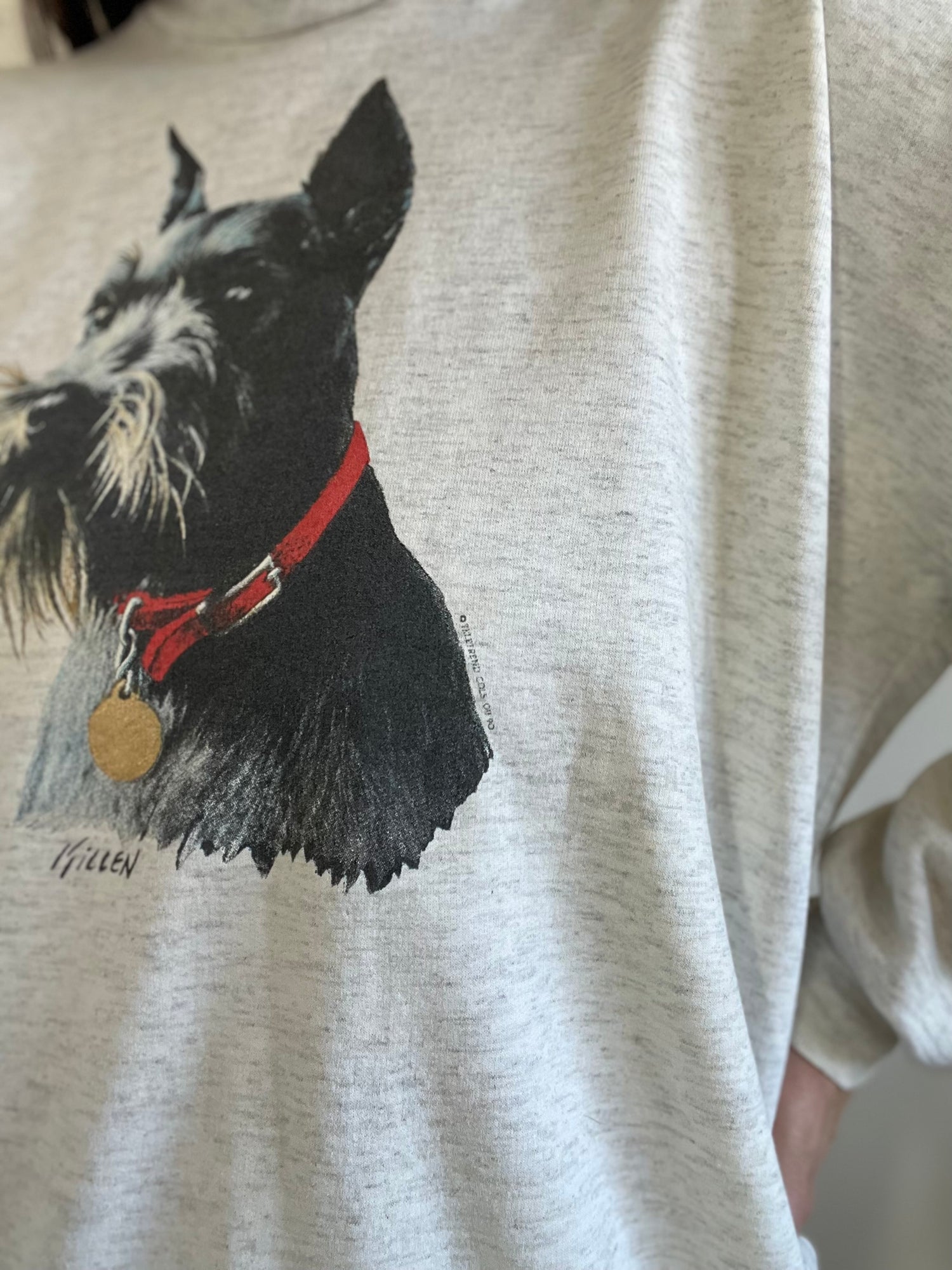 A 90s vintage heather grey sweatshirt with an image of a schnauzer dog. Artist "Killen" signature in the bottom corner. Killen was an artist, who is known for his wildlife shots - and this one is called "That's My Dog". Elasticized hem, relaxed fit. Great vintage condition.