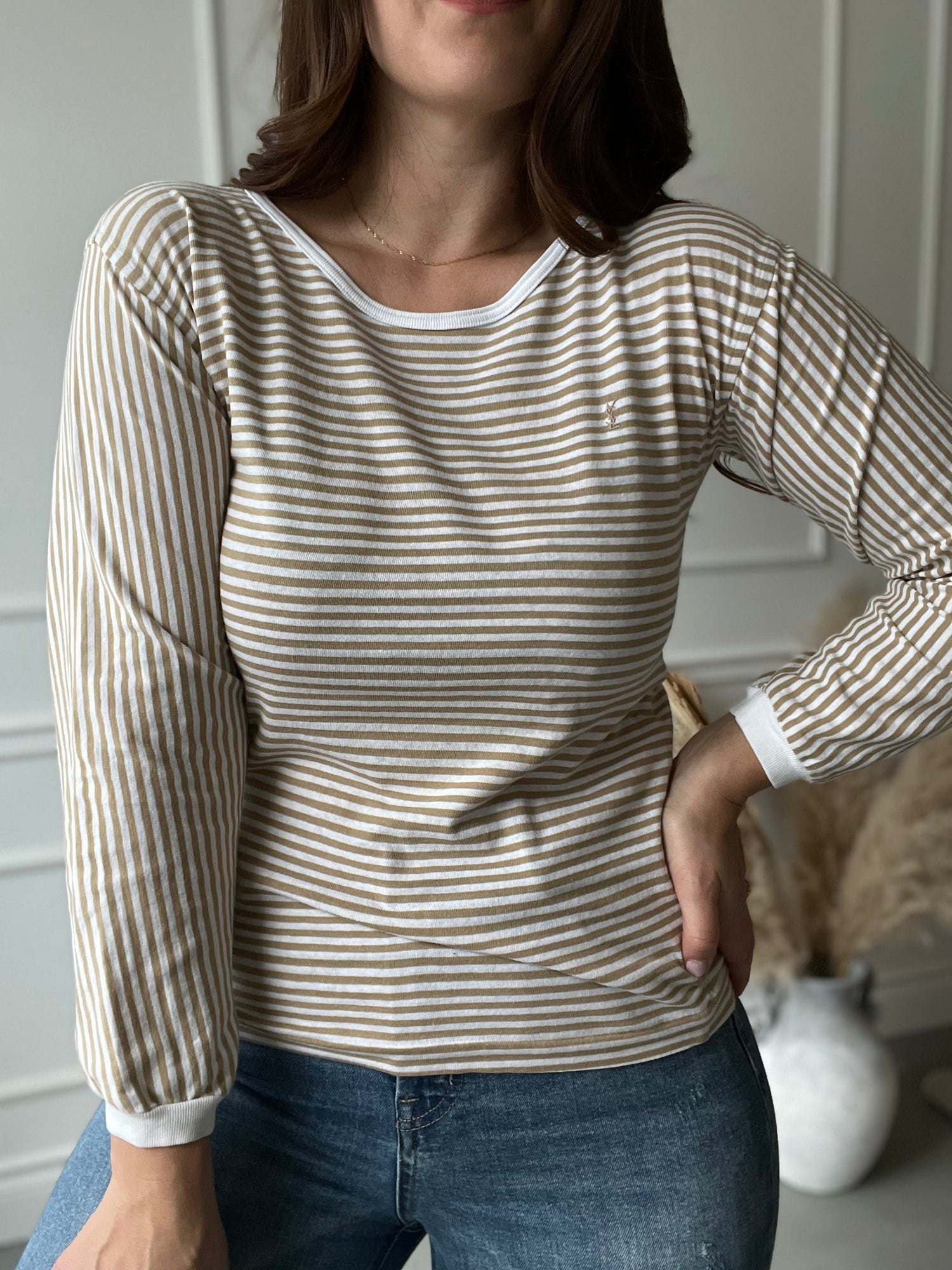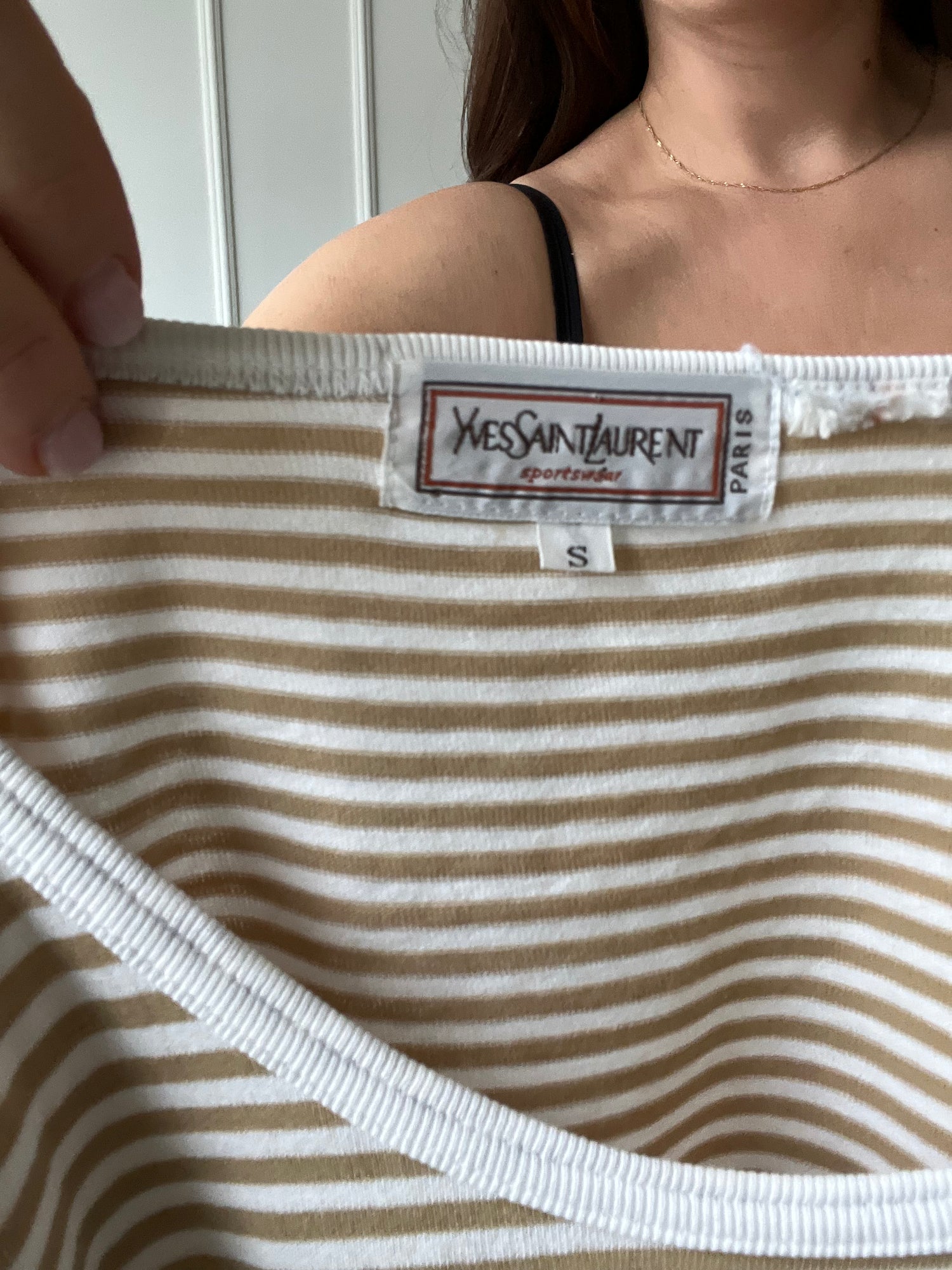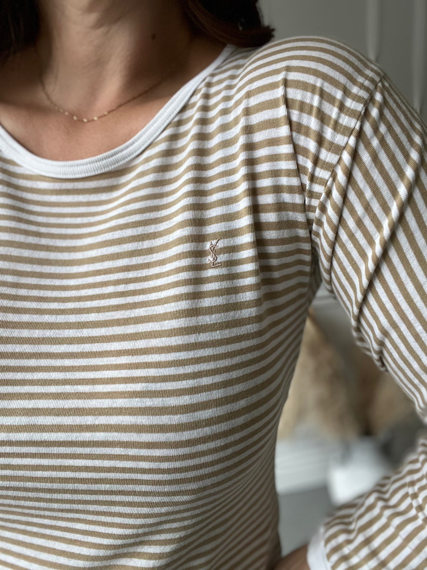 A vintage, Yves Saint Laurent cotton longe sleeve shirt with beige and off-shite striped throughout. The inside tag is still in tact, with a flawless embroidered logo in the top left chest corner. White ribbing detail at cuffs and a scooped neck. Tagged a small, but could be worn as a medium too - its roomy and stretchy.
