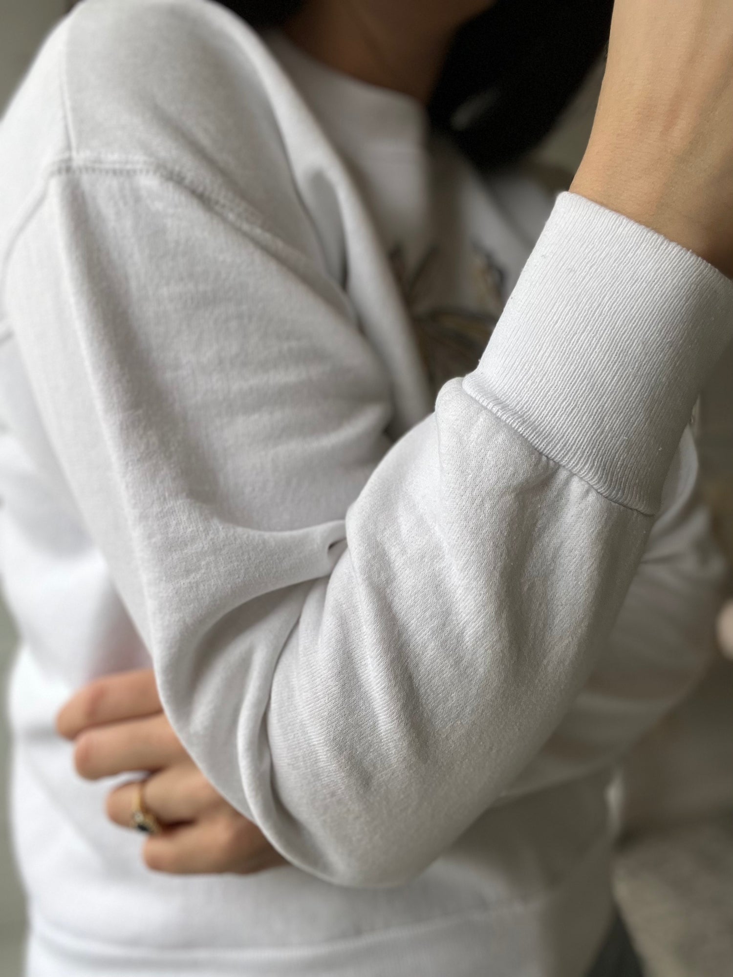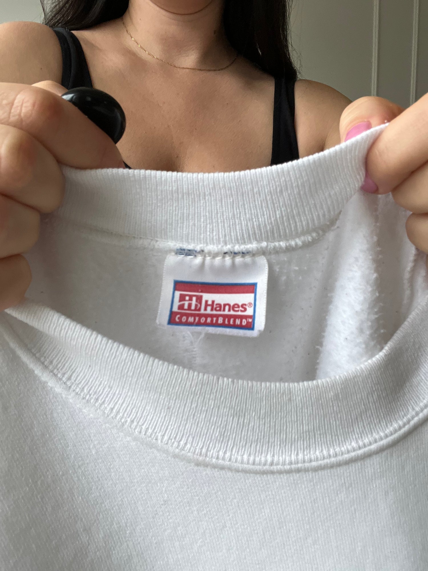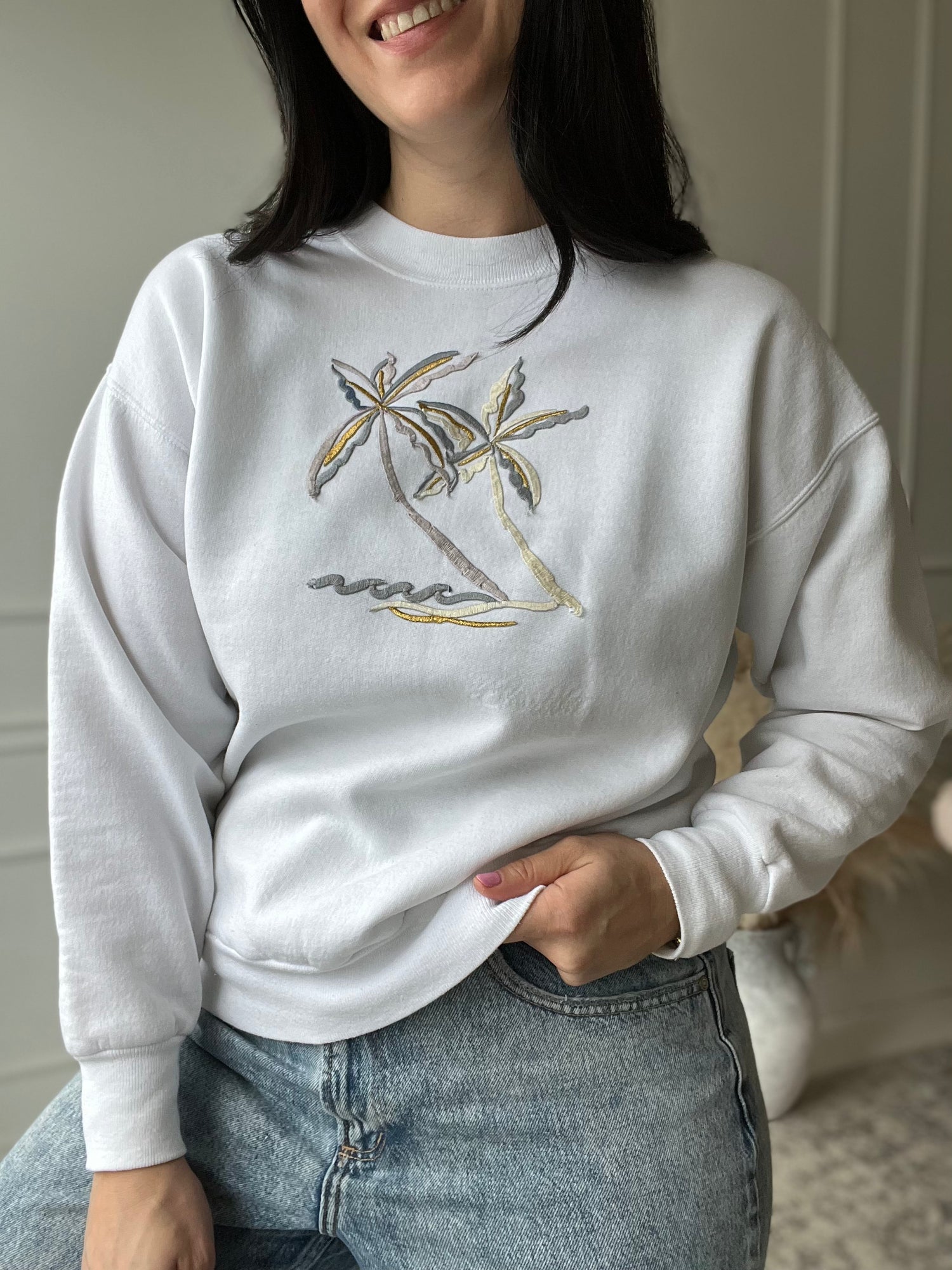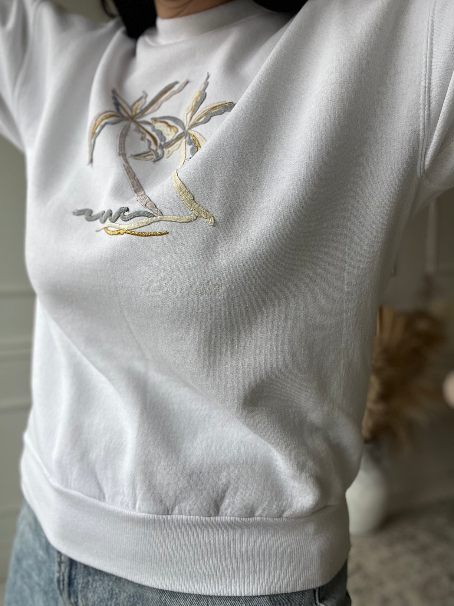 A starch white crewneck sweater with textured stitch ribbon making waves. The muted neutrals and gold scream 90s beachside. You can see a slightly faded city name below the waves - but I can't make it out. Can you? This gorgeous crewneck is in perfect condition.