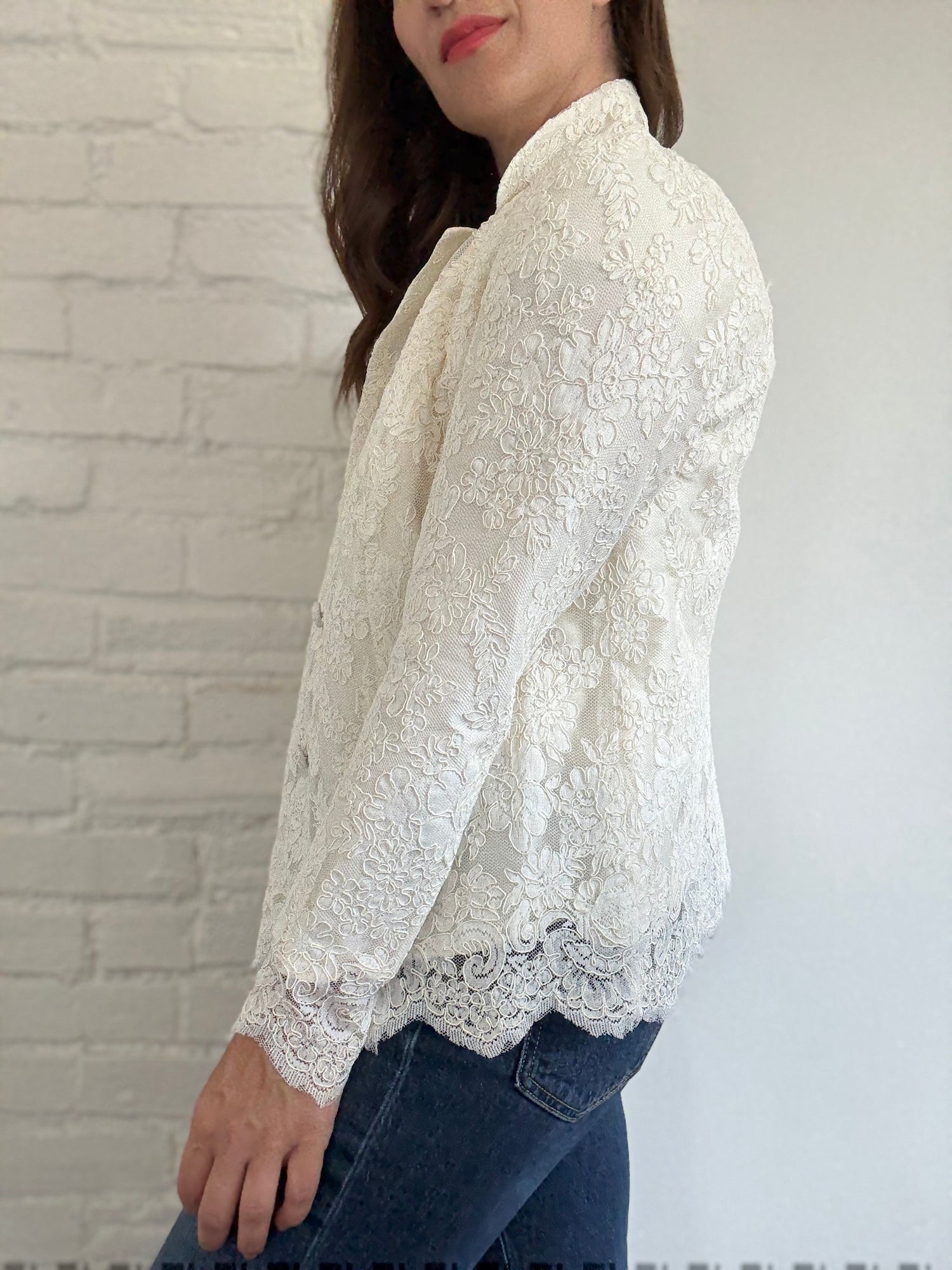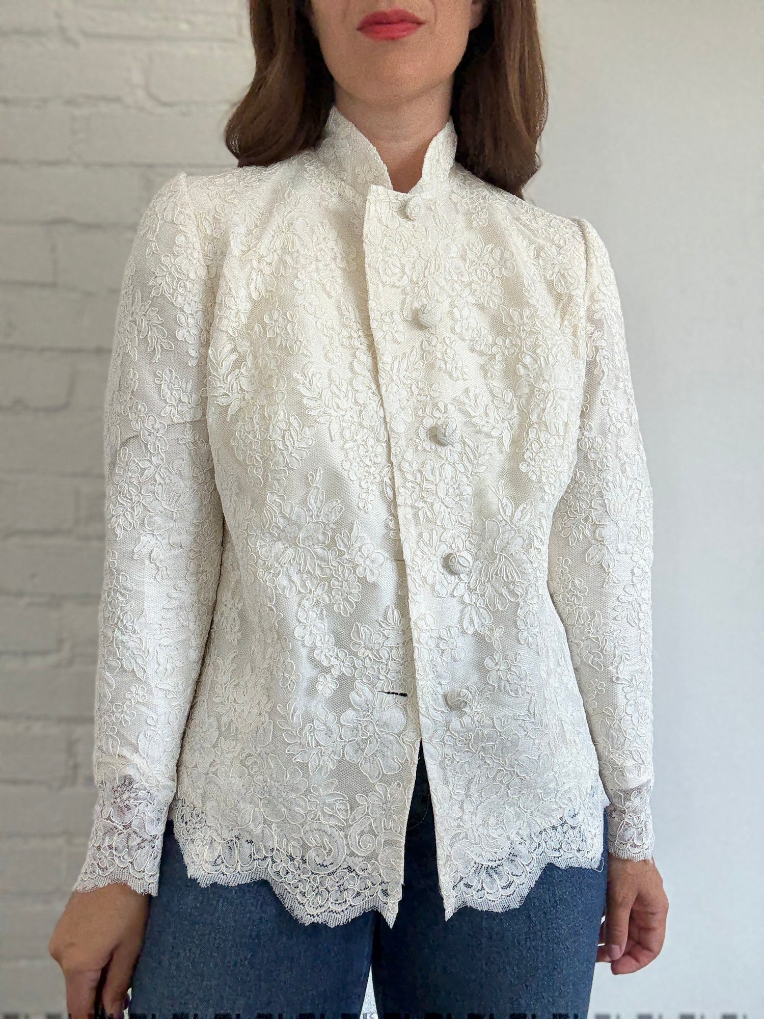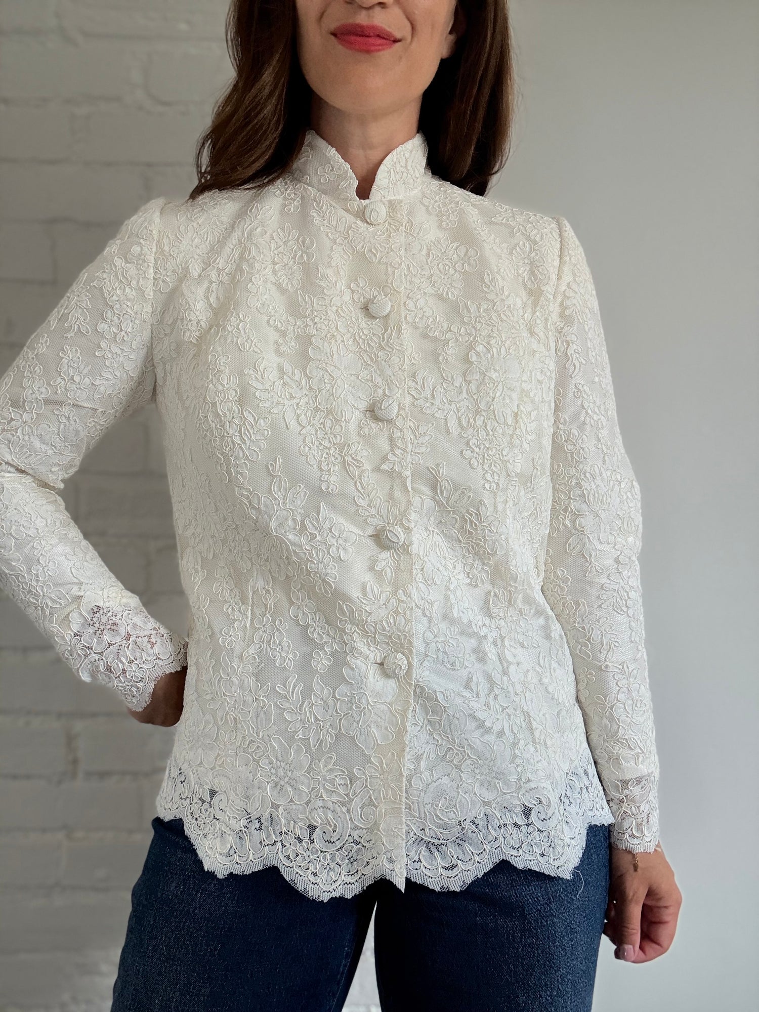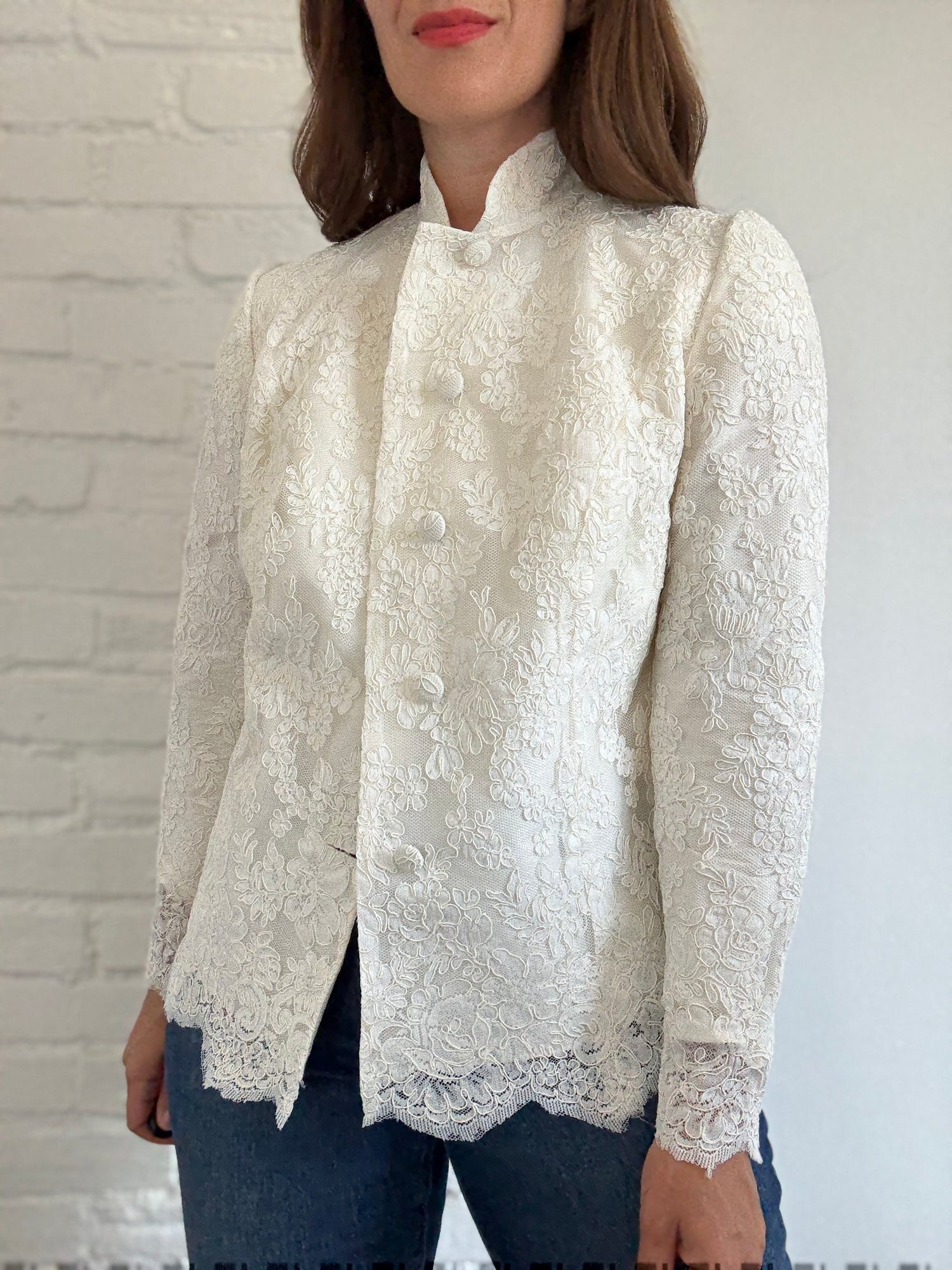 This stunning vintage, lace blazer-jacket is composed of a striking white lace and features scalloped edges on the hem, and cuffs. The front closure is material buttons, but can also be worn open for a less structured look. Mock neck, and asymmetrical down the front middle. The lace is a stunning, high quality vintage that overlays onto of a dupioni silk. Like brant new, mint condition.