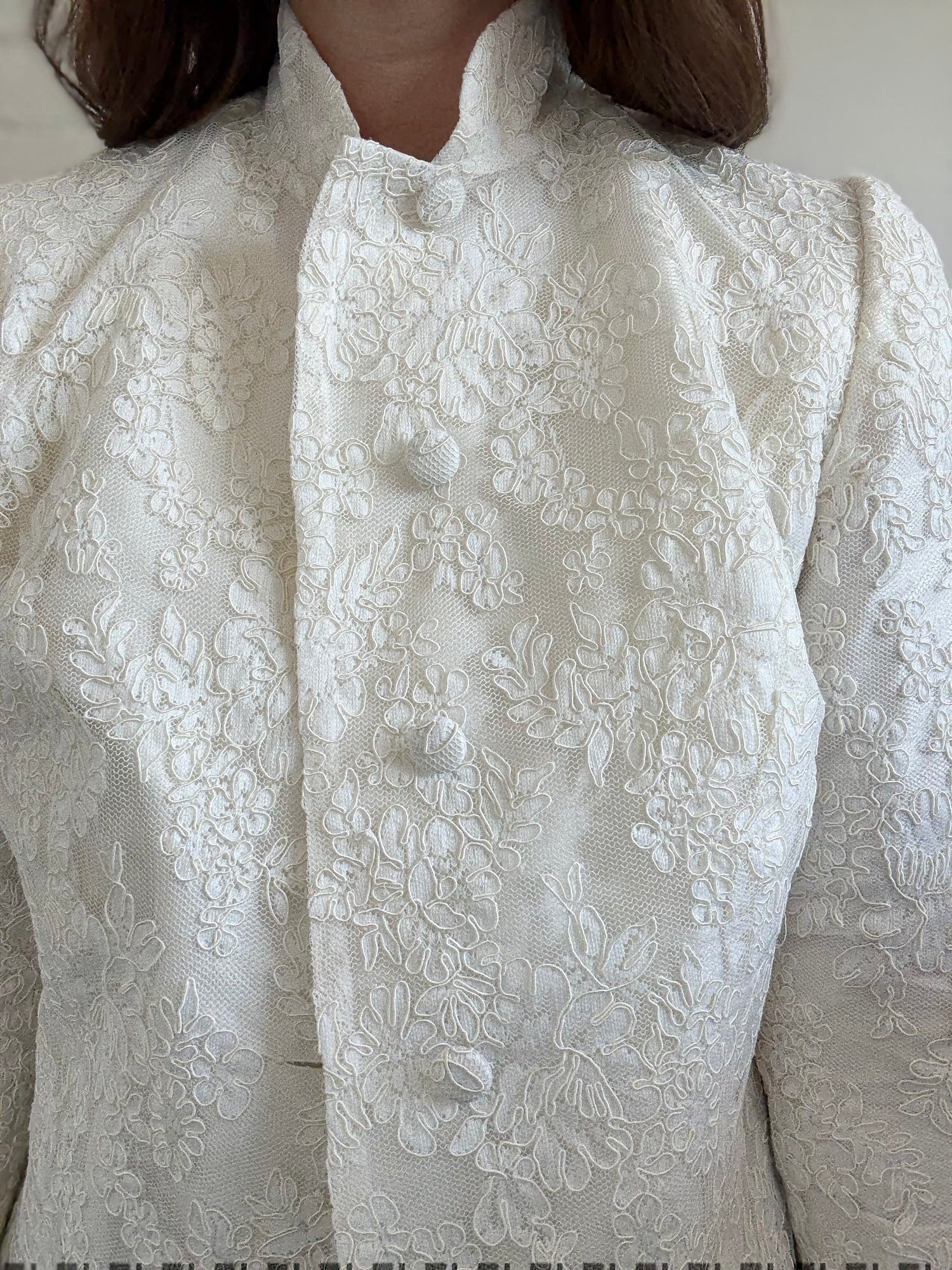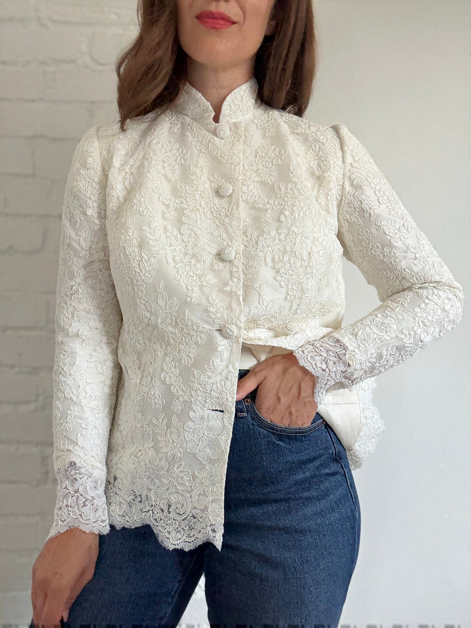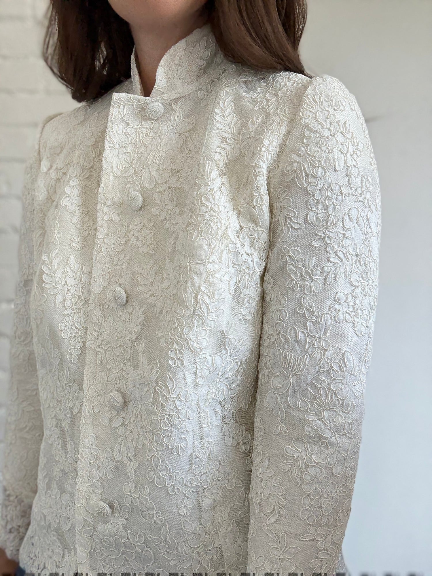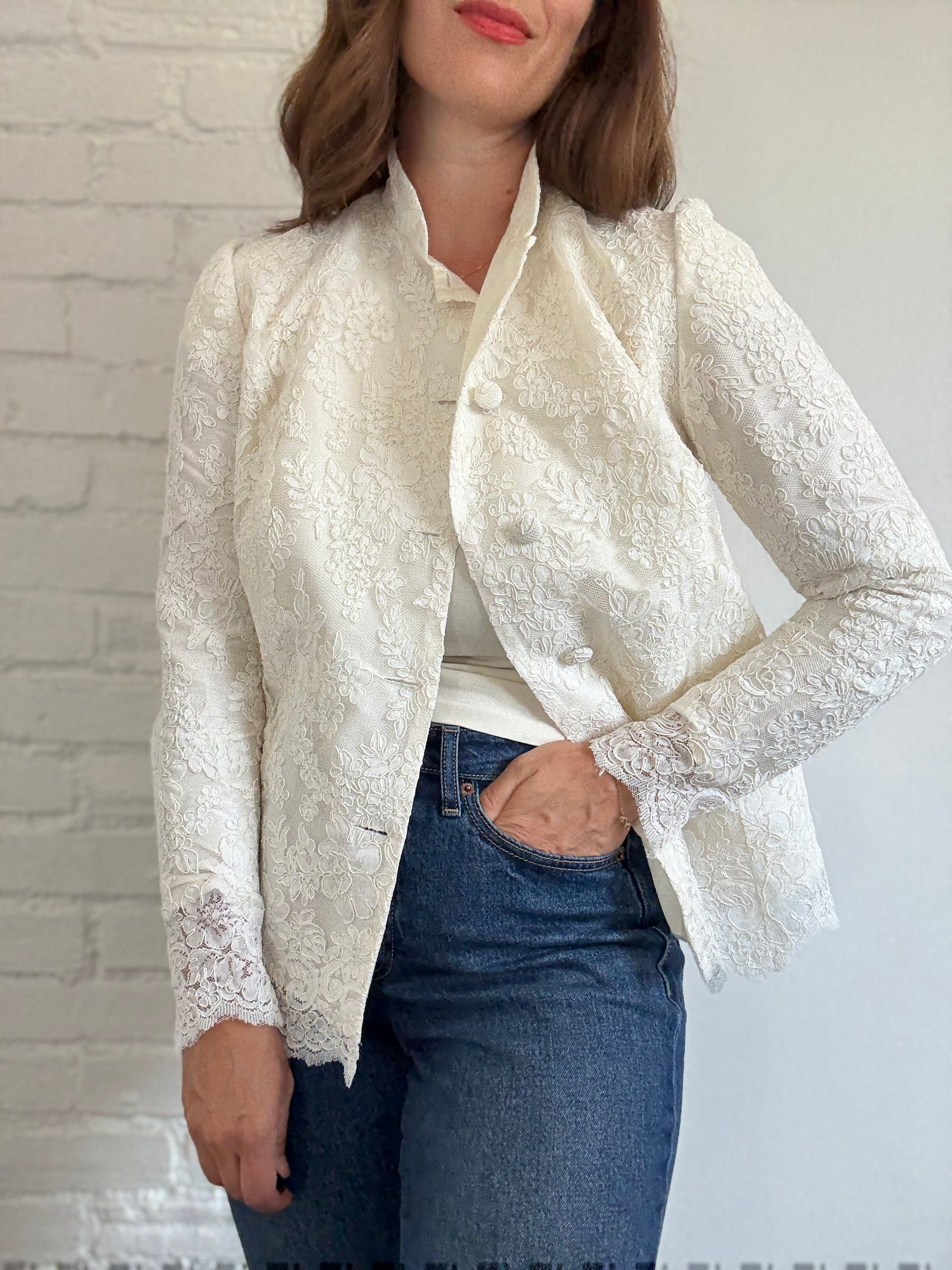 This stunning vintage, lace blazer-jacket is composed of a striking white lace and features scalloped edges on the hem, and cuffs. The front closure is material buttons, but can also be worn open for a less structured look. Mock neck, and asymmetrical down the front middle. The lace is a stunning, high quality vintage that overlays onto of a dupioni silk. Like brant new, mint condition.