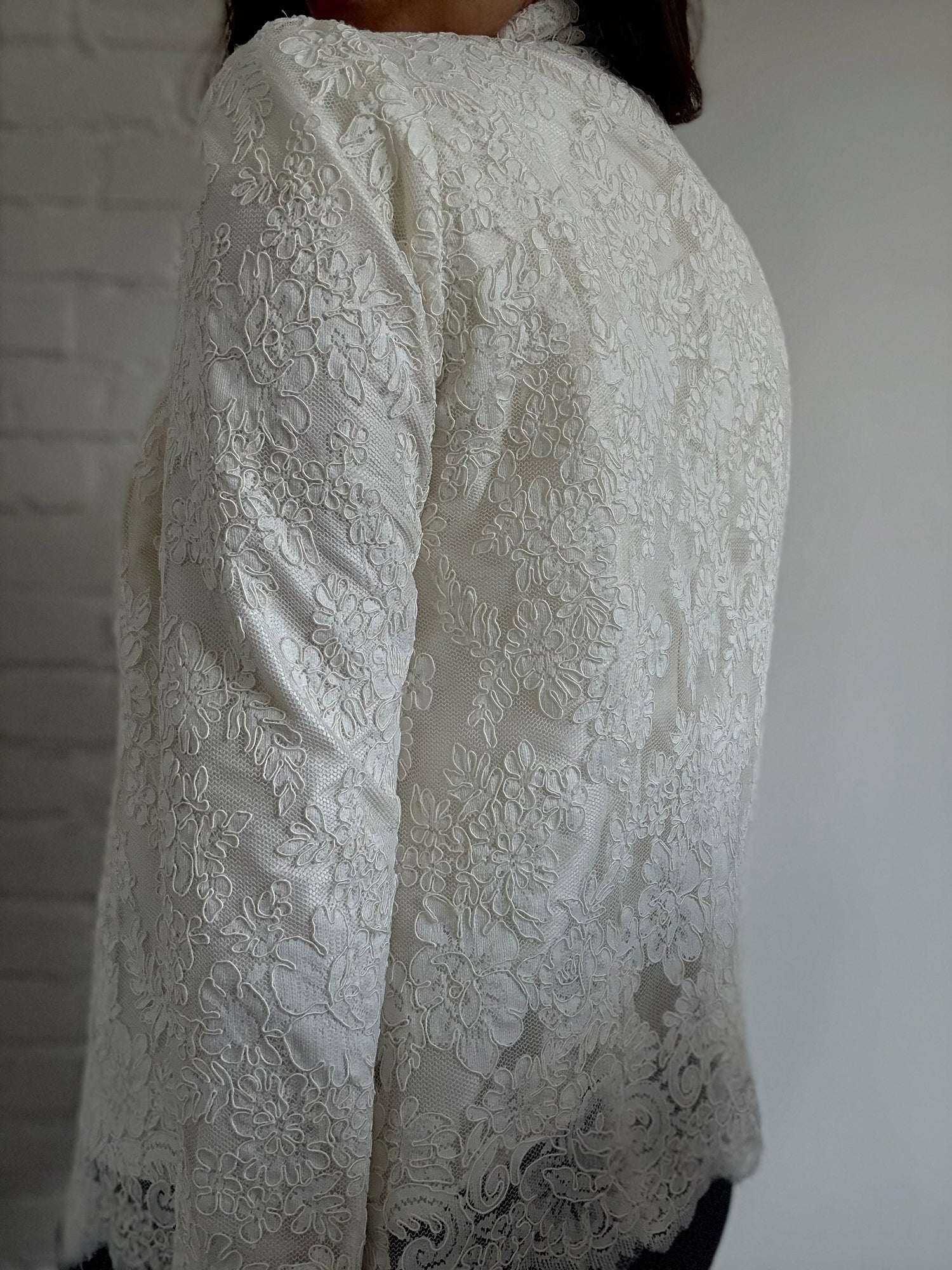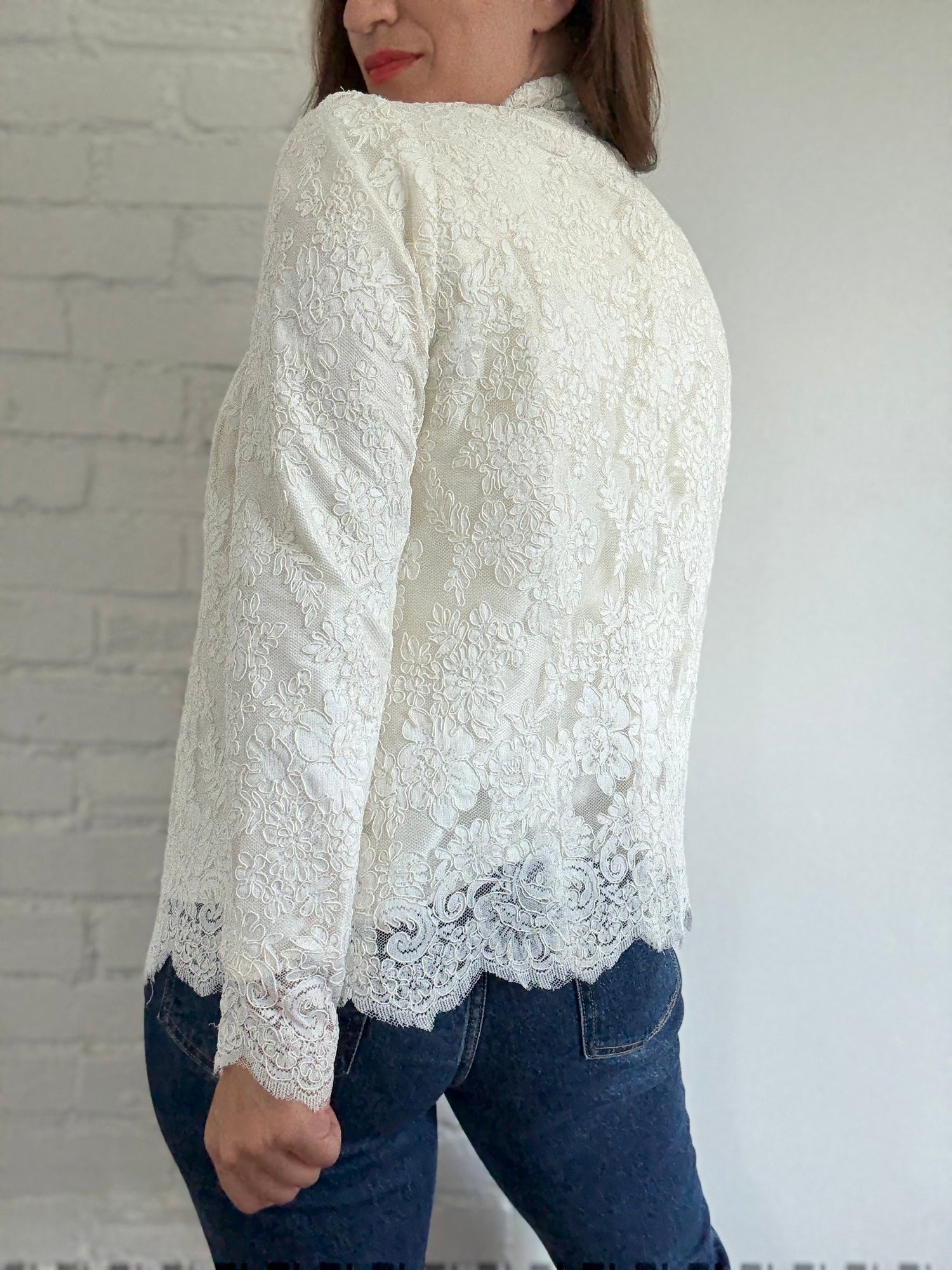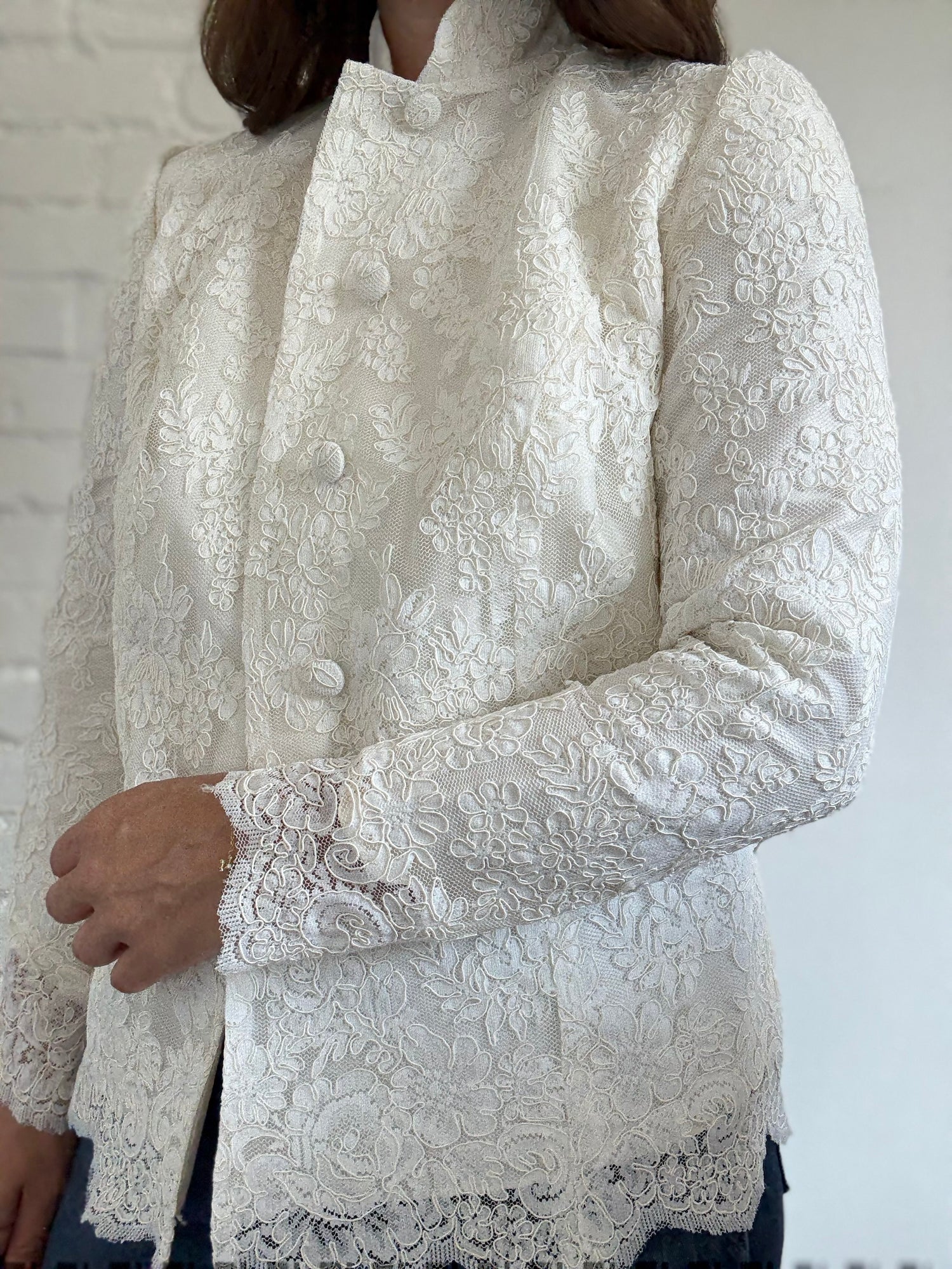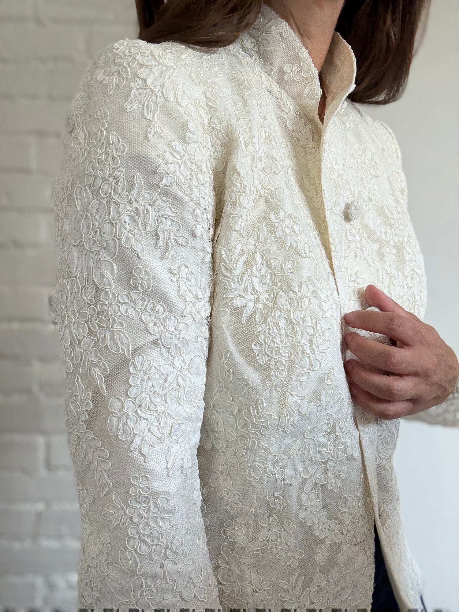 This stunning vintage, lace blazer-jacket is composed of a striking white lace and features scalloped edges on the hem, and cuffs. The front closure is material buttons, but can also be worn open for a less structured look. Mock neck, and asymmetrical down the front middle. The lace is a stunning, high quality vintage that overlays onto of a dupioni silk. Like brant new, mint condition.
