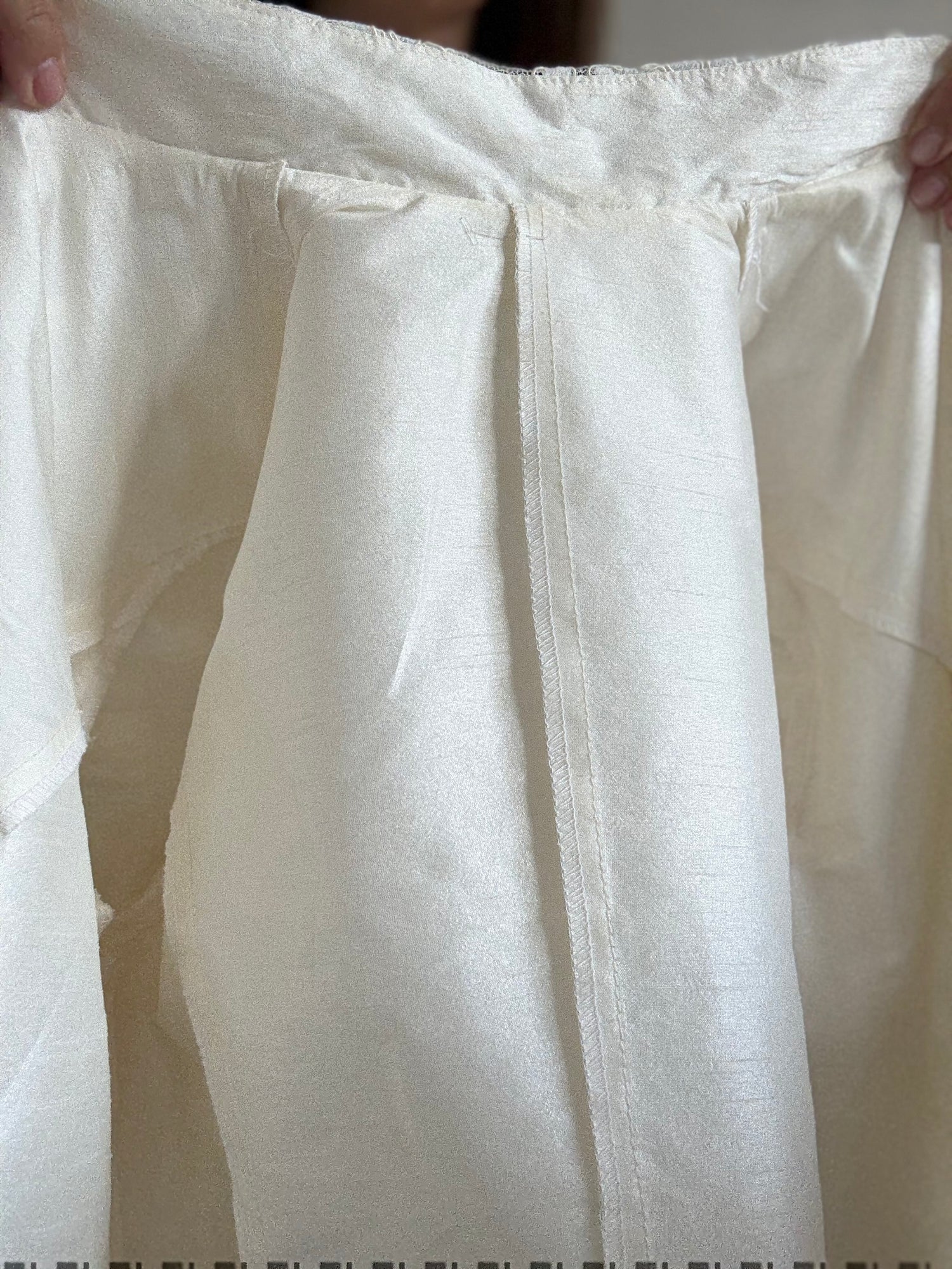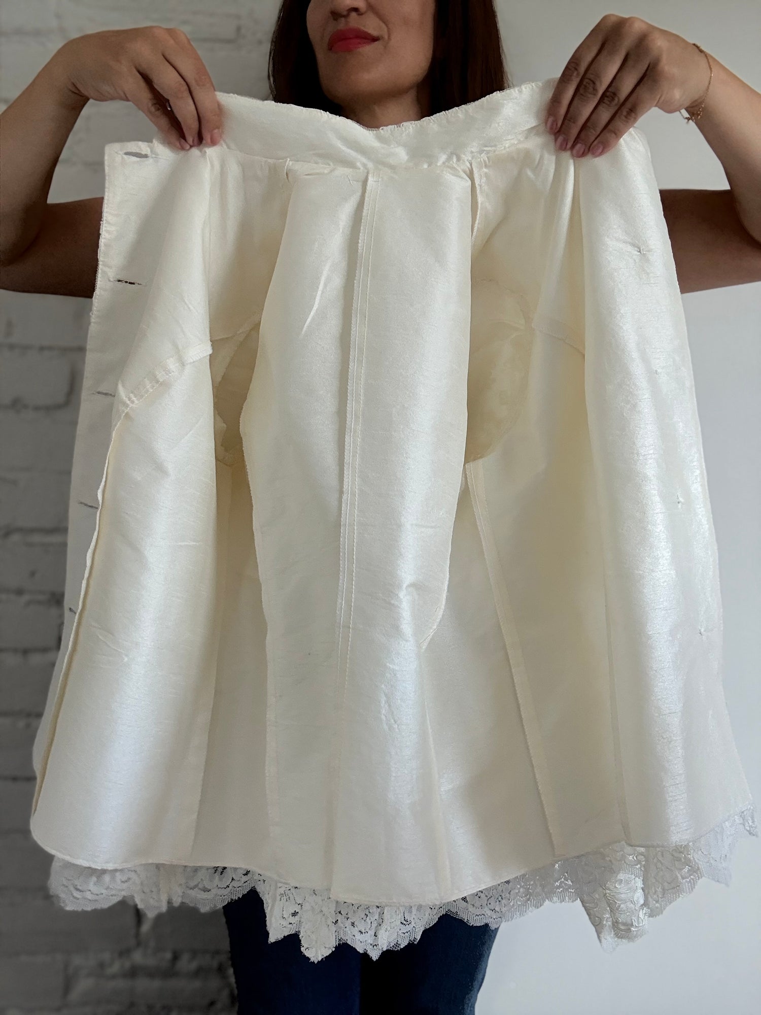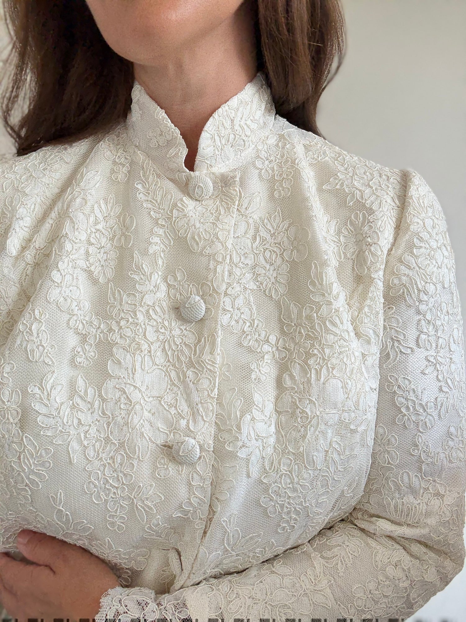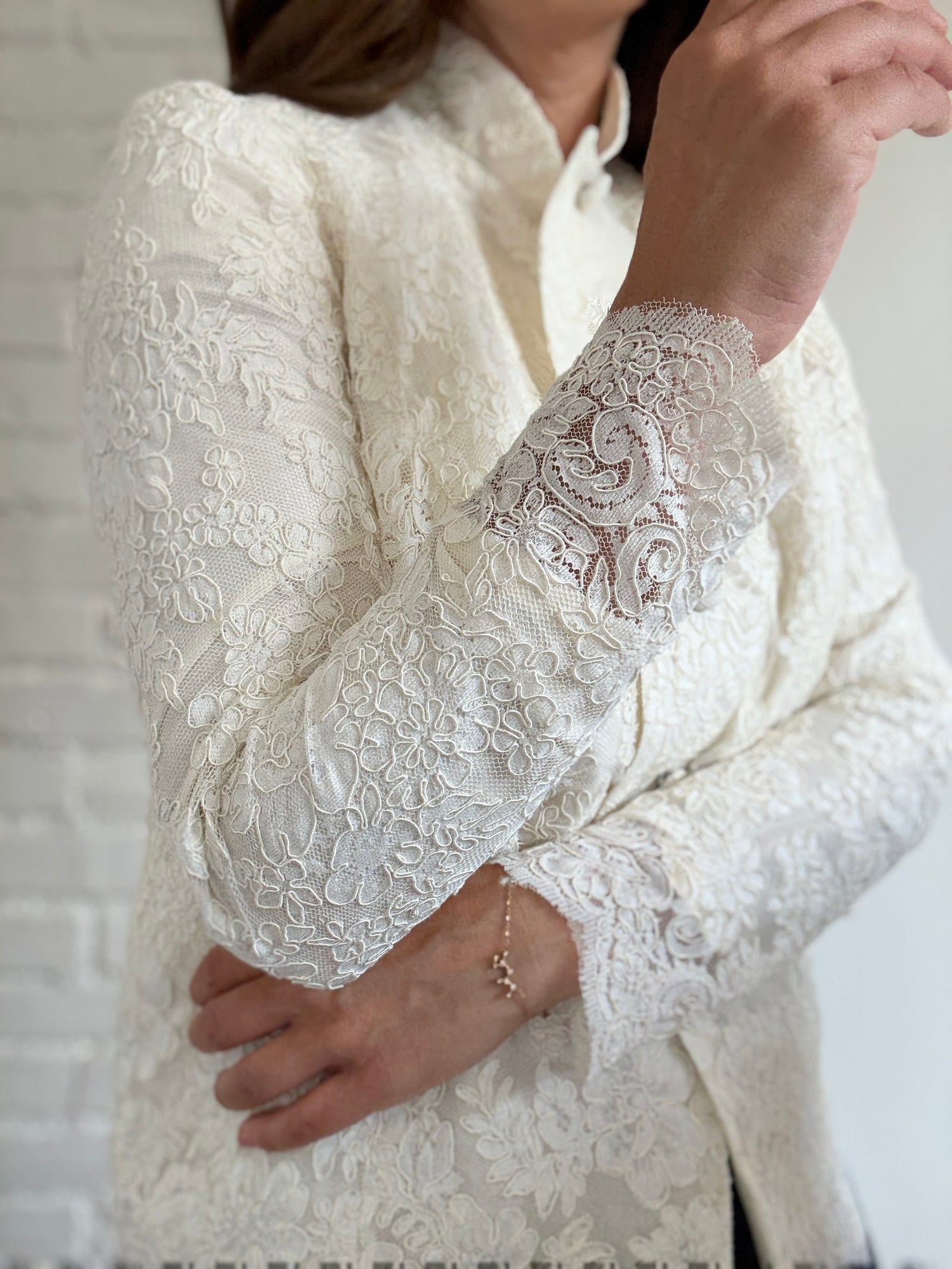 This stunning vintage, lace blazer-jacket is composed of a striking white lace and features scalloped edges on the hem, and cuffs. The front closure is material buttons, but can also be worn open for a less structured look. Mock neck, and asymmetrical down the front middle. The lace is a stunning, high quality vintage that overlays onto of a dupioni silk. Like brant new, mint condition.