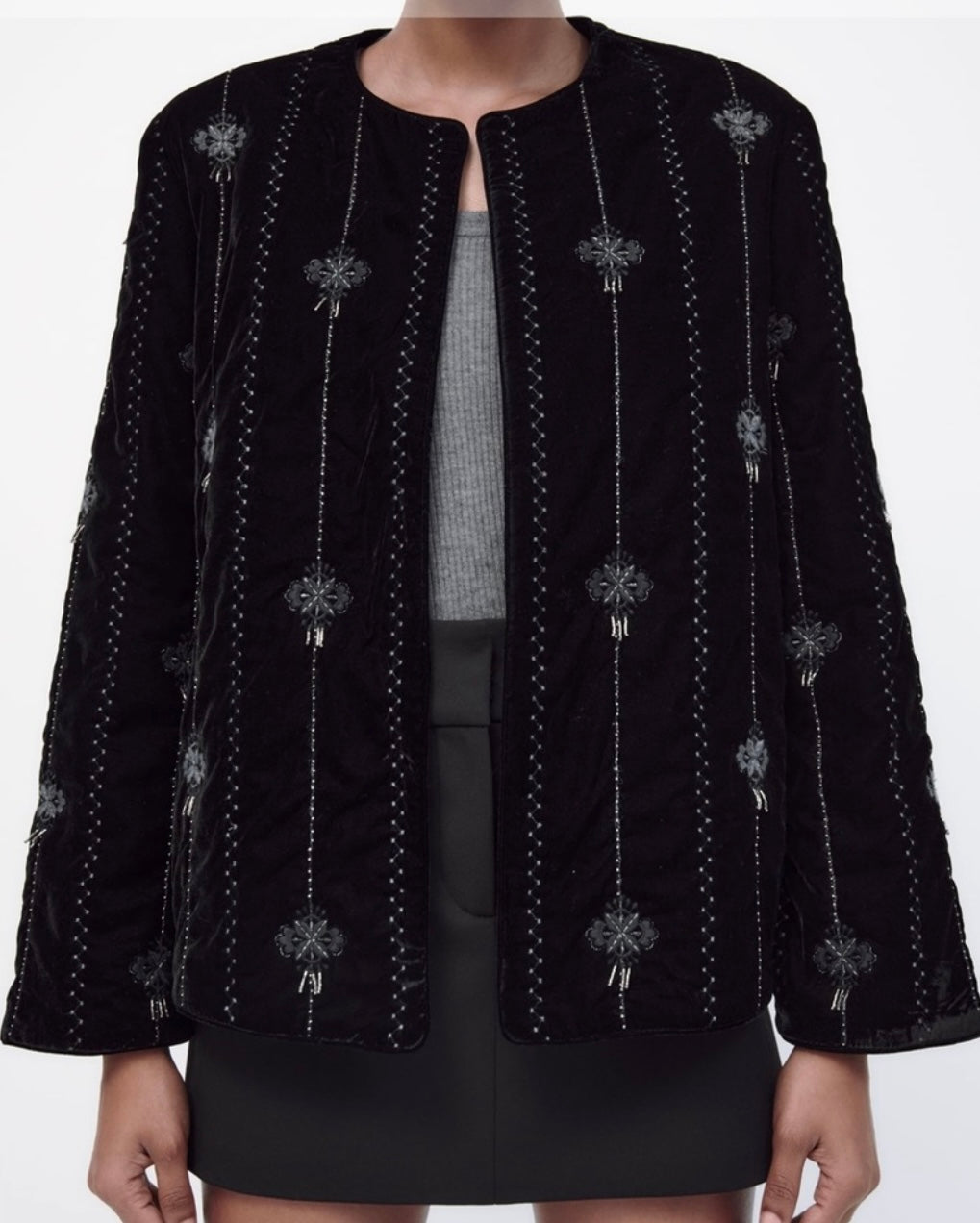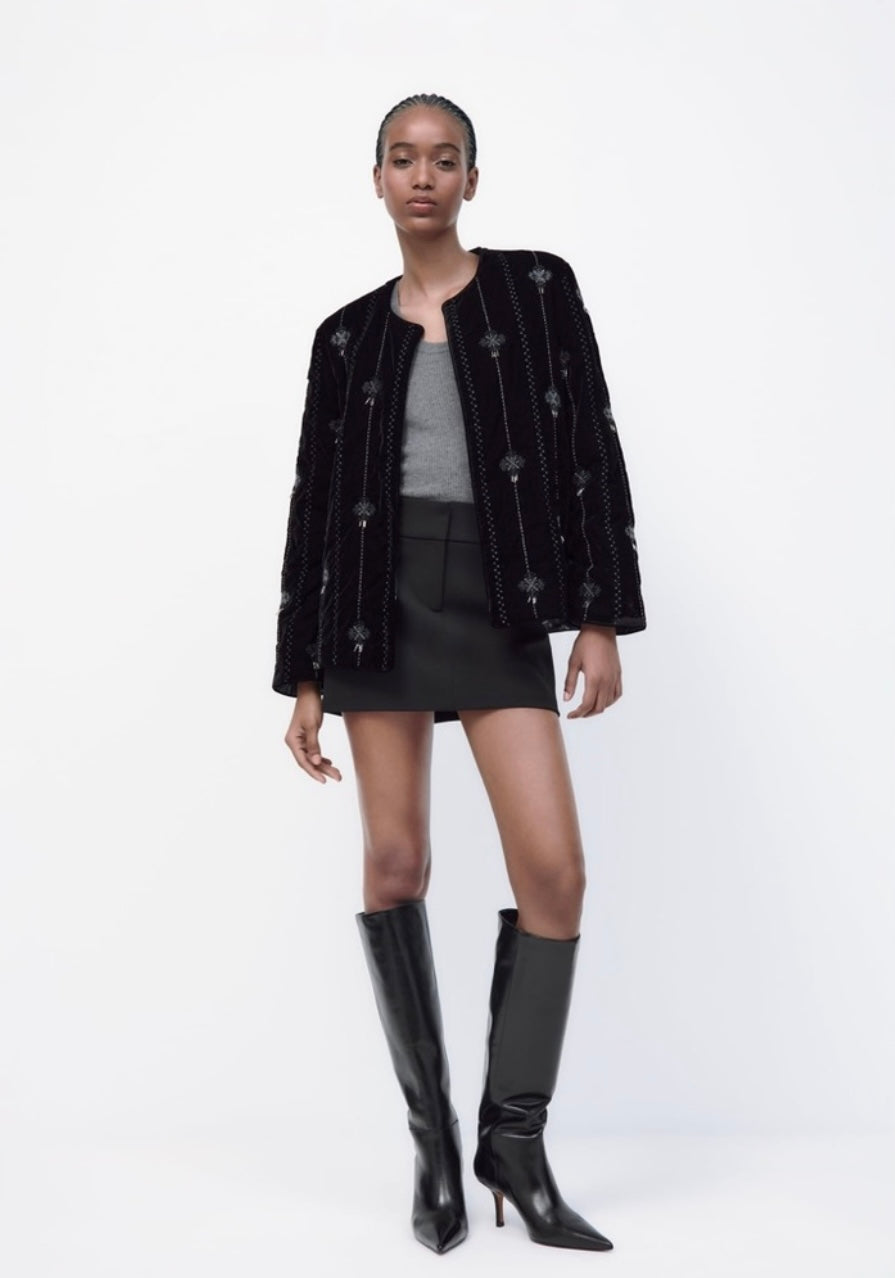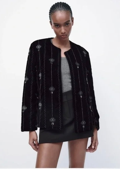 Like brand new, the iconic Zara Embroidered Velvet Jacket. Round neck, and embroidered detail with bead applique. Printed interior lining. All over black, with dulled silver beading. Worn open with a slightly oversized fit. Retails for $149.