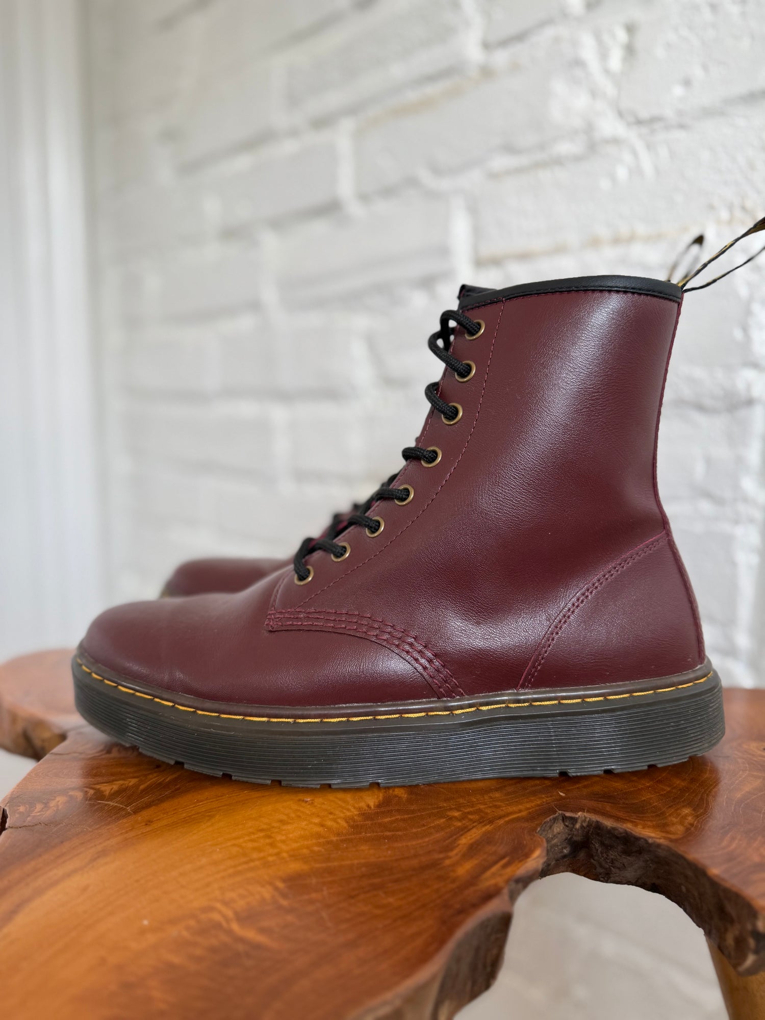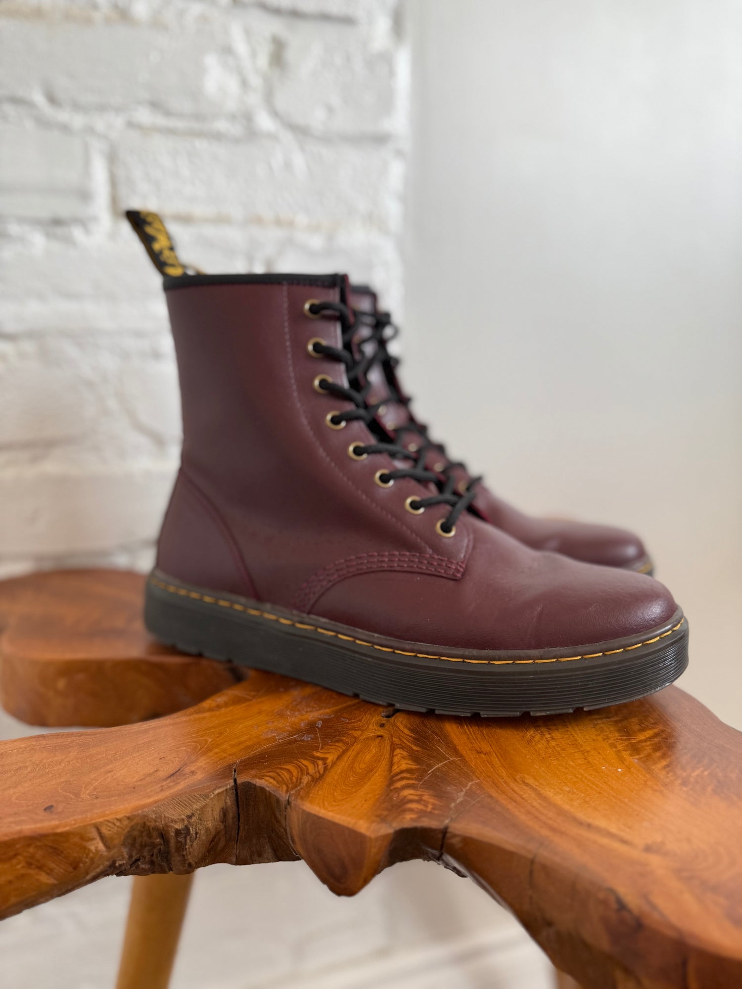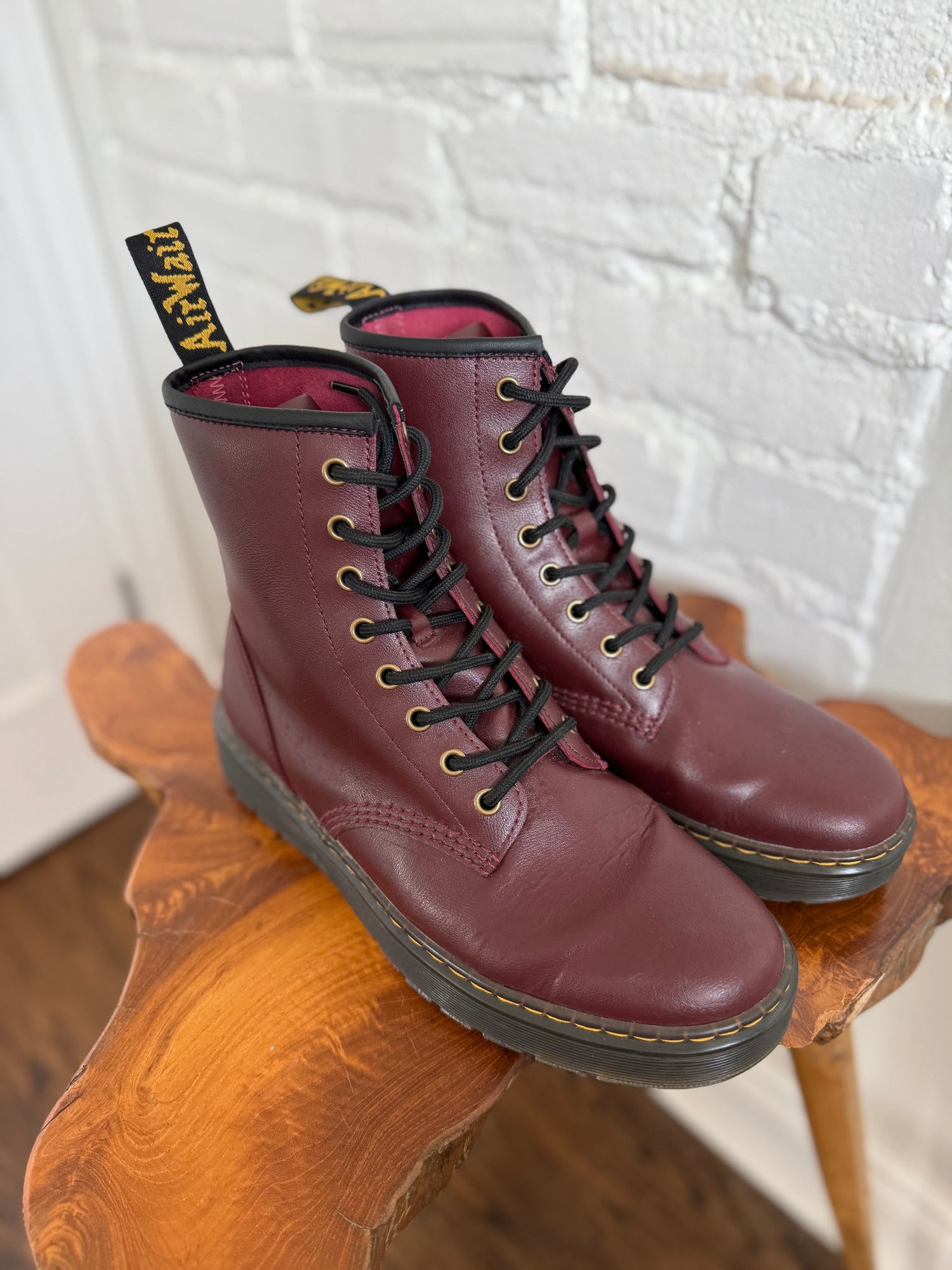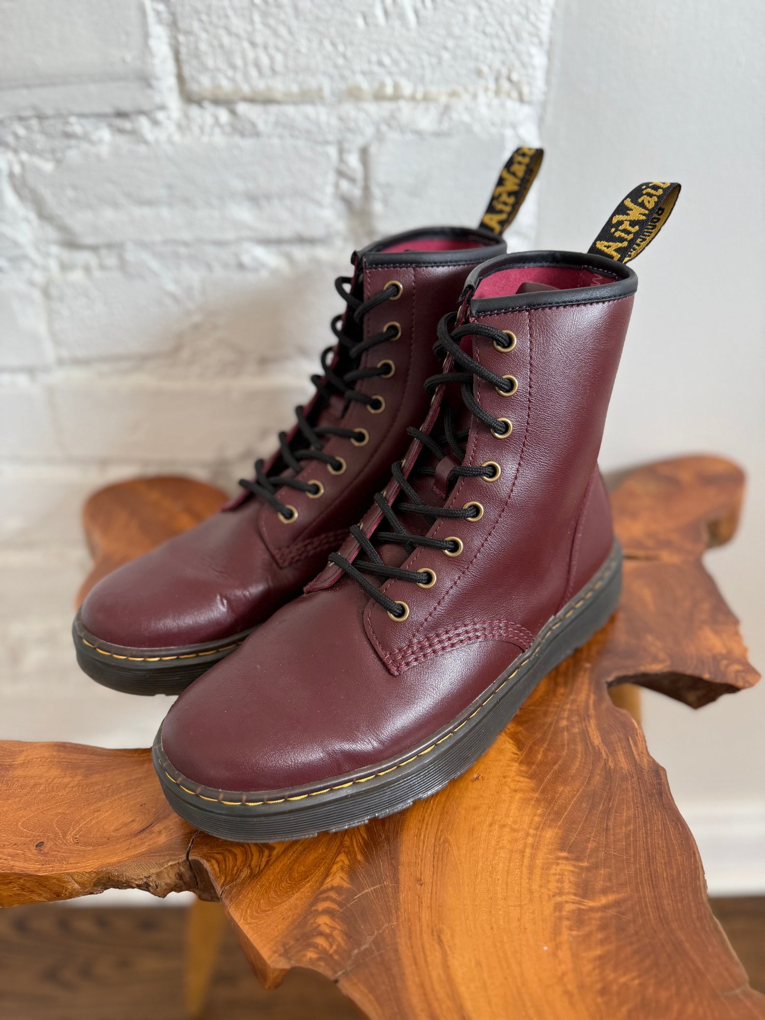 A classic style from the brand you love in the women's Dr. Martens Zavala Combat Boot. A gorgeous matte burgundy colour, and in brand-new condition. Leather upper in a casual lace-up boot style with a round toe. Full-lace-up front eith the metal eyelets. Pull loop at collar for easy on-and-off. Leather and textile lining with a cushioning insole. Classic constrast stitching at the midsole. Air cushion outsole. Mint condition, like brand new. Retails for $170.00 CDN.
