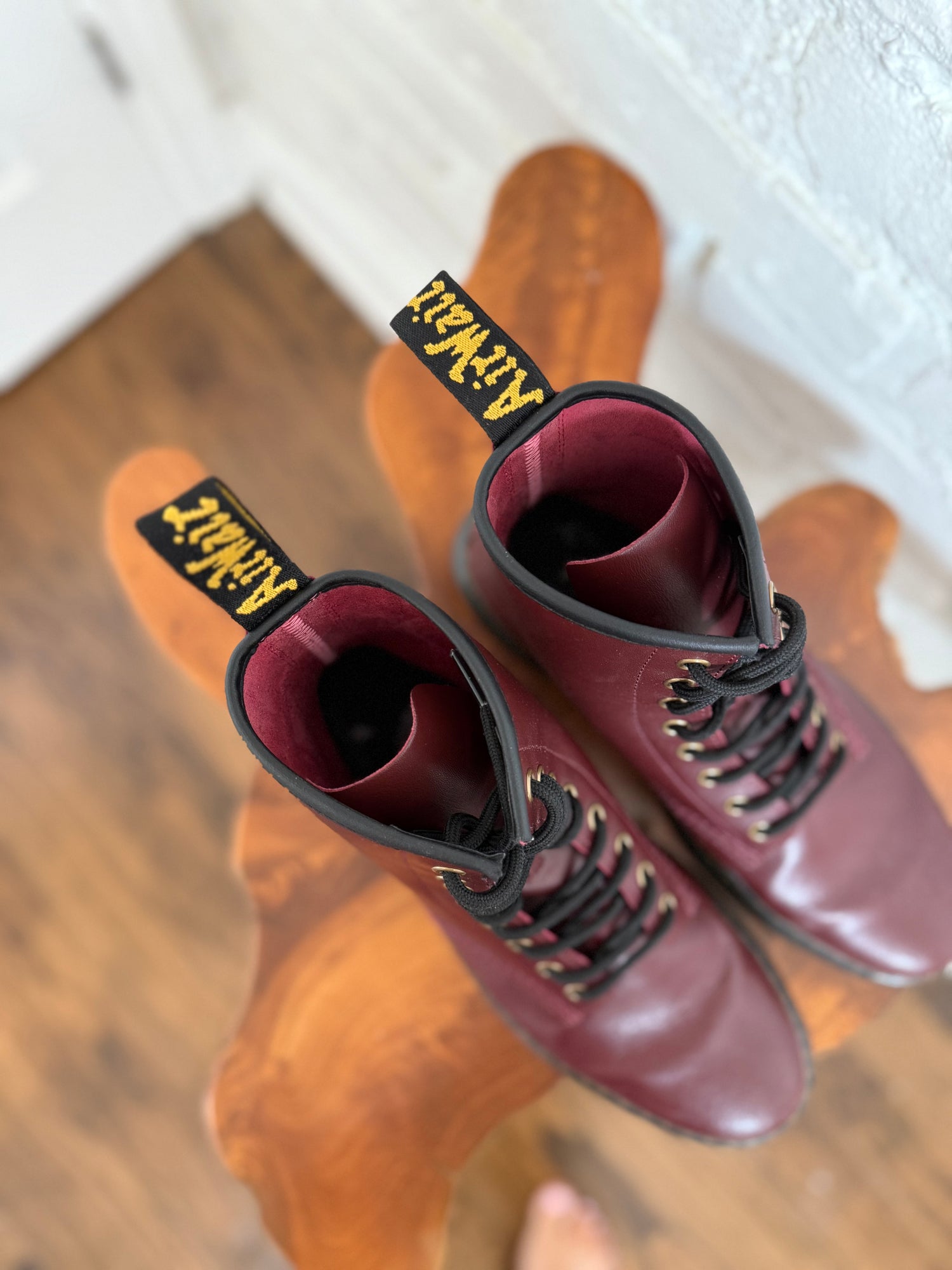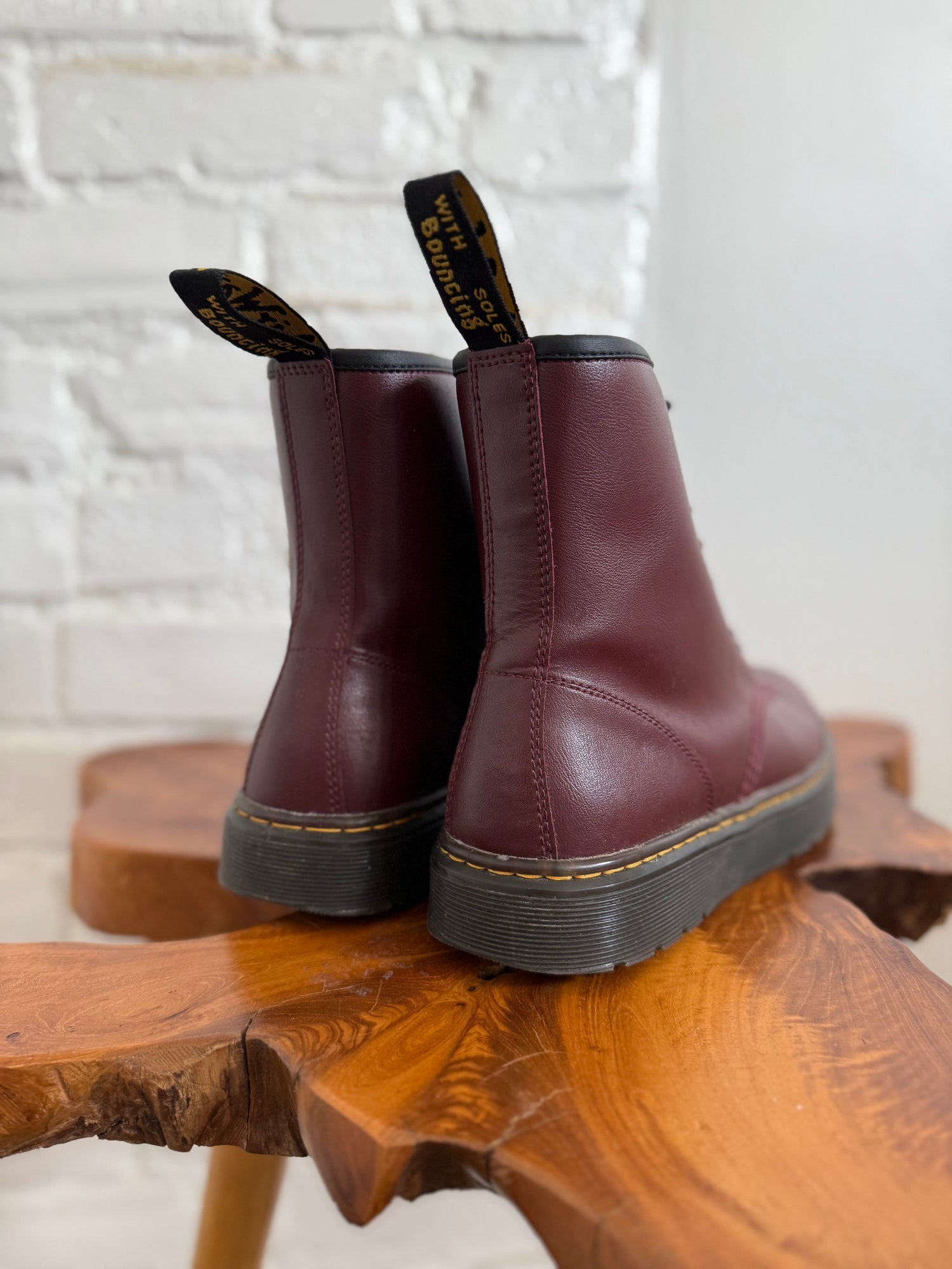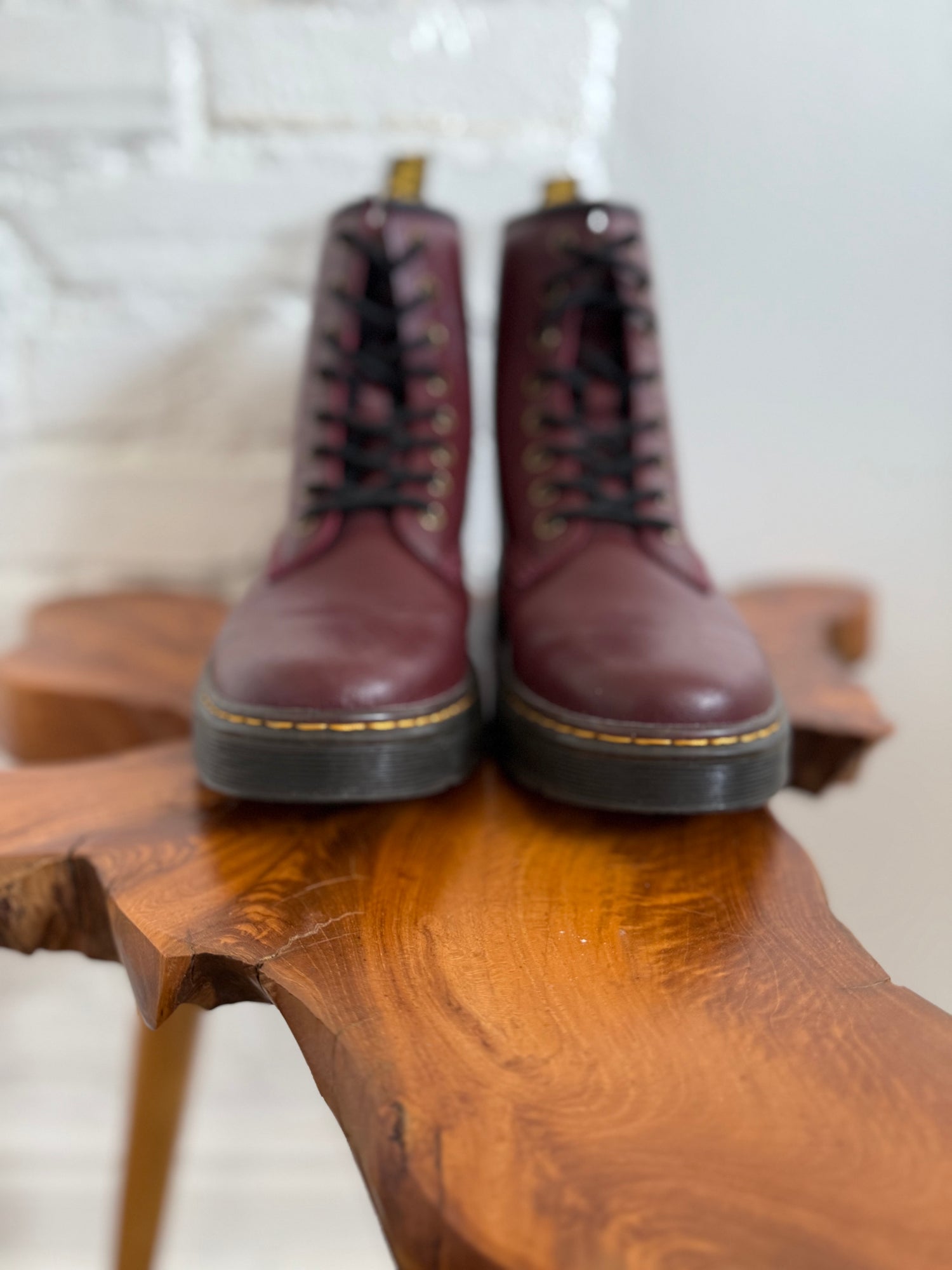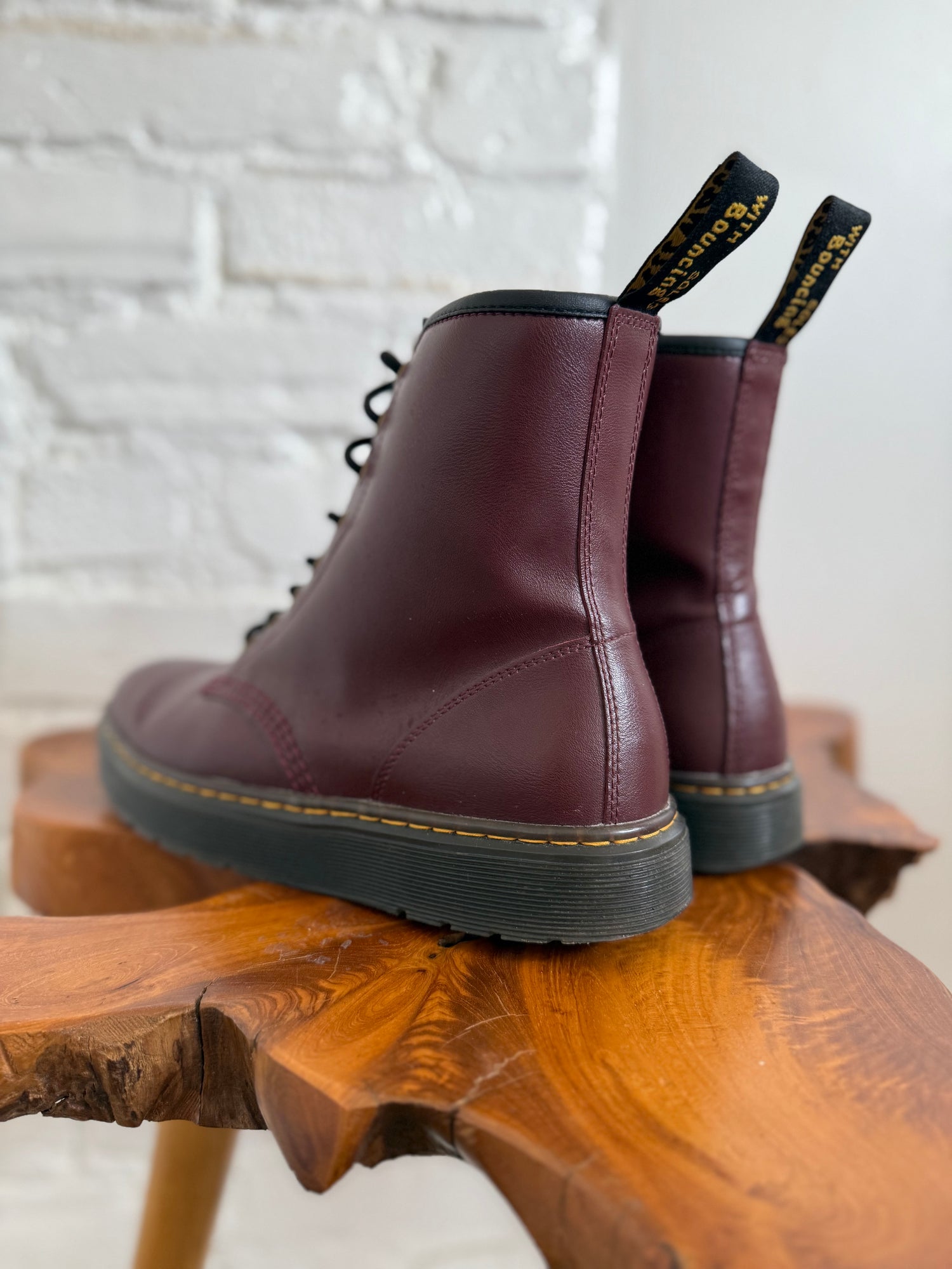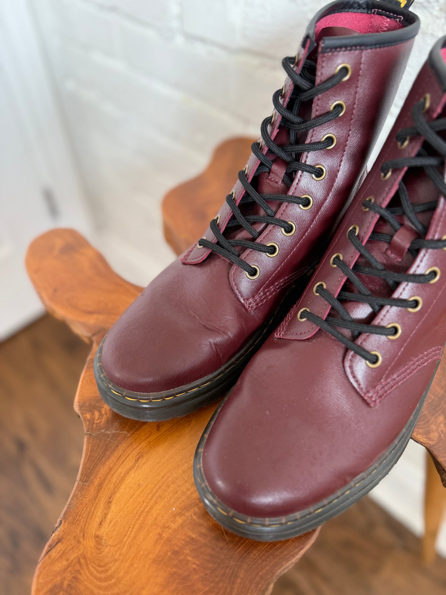 A classic style from the brand you love in the women's Dr. Martens Zavala Combat Boot. A gorgeous matte burgundy colour, and in brand-new condition. Leather upper in a casual lace-up boot style with a round toe. Full-lace-up front eith the metal eyelets. Pull loop at collar for easy on-and-off. Leather and textile lining with a cushioning insole. Classic constrast stitching at the midsole. Air cushion outsole. Mint condition, like brand new. Retails for $170.00 CDN.