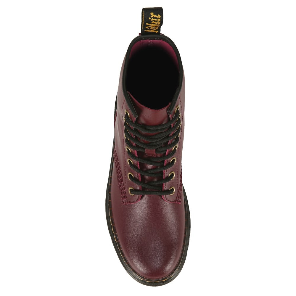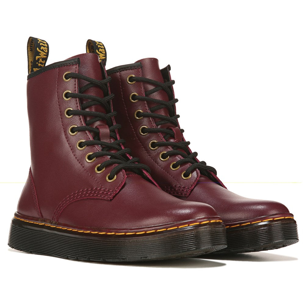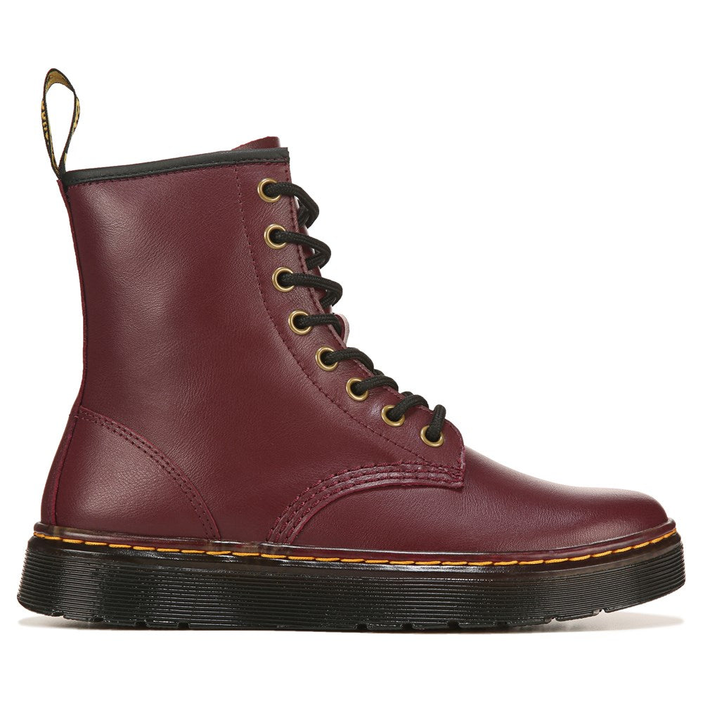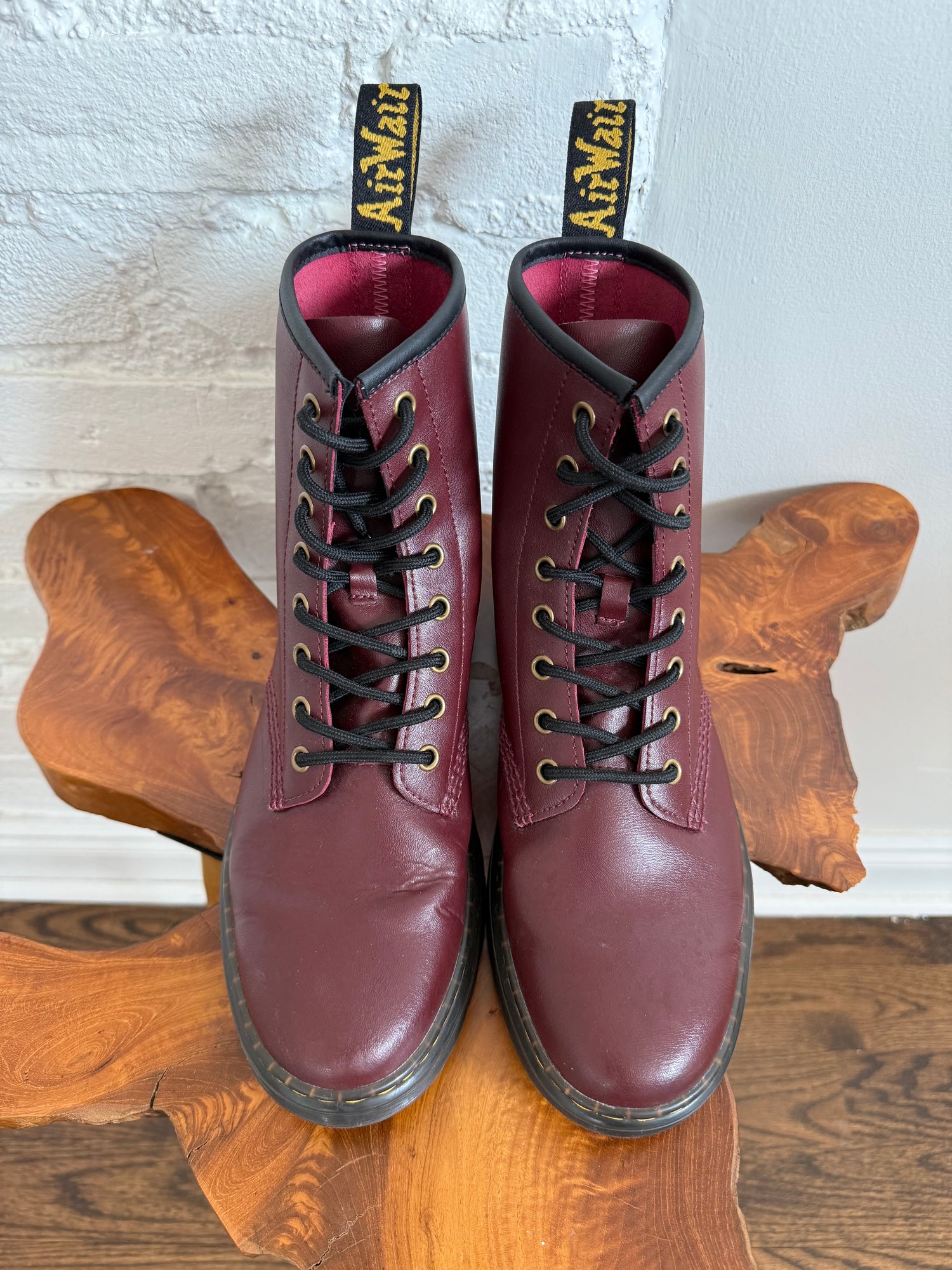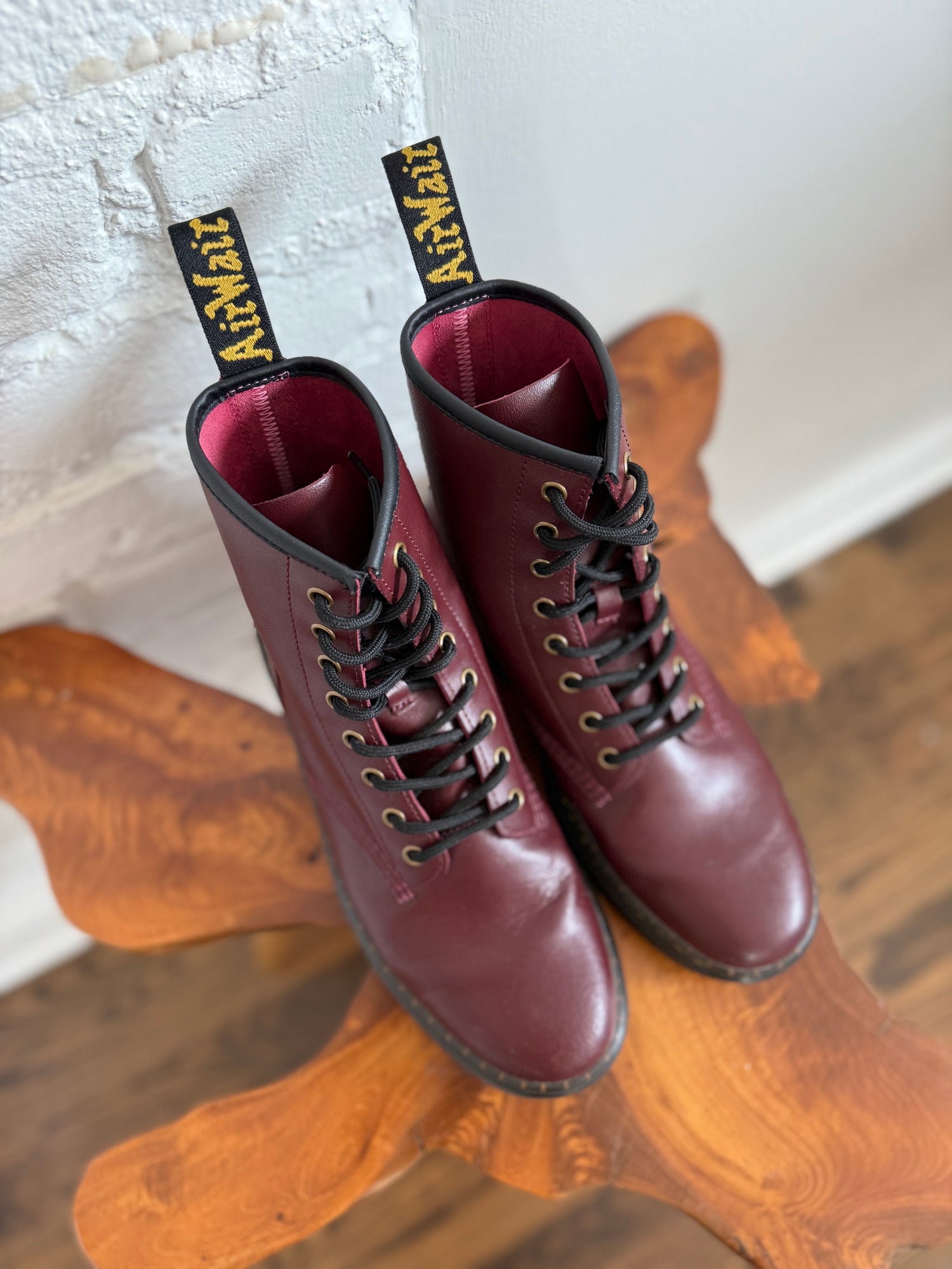 A classic style from the brand you love in the women's Dr. Martens Zavala Combat Boot. A gorgeous matte burgundy colour, and in brand-new condition. Leather upper in a casual lace-up boot style with a round toe. Full-lace-up front eith the metal eyelets. Pull loop at collar for easy on-and-off. Leather and textile lining with a cushioning insole. Classic constrast stitching at the midsole. Air cushion outsole. Mint condition, like brand new. Retails for $170.00 CDN.